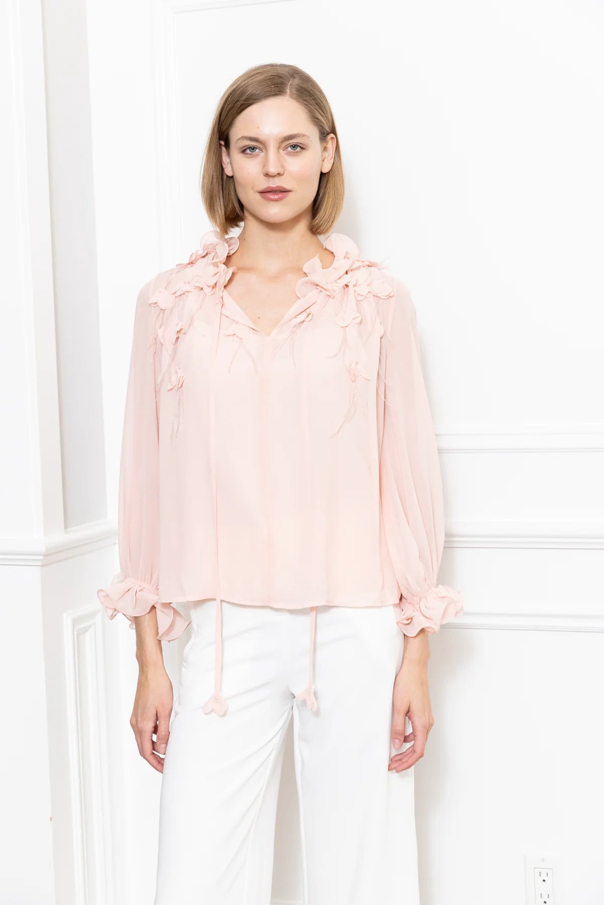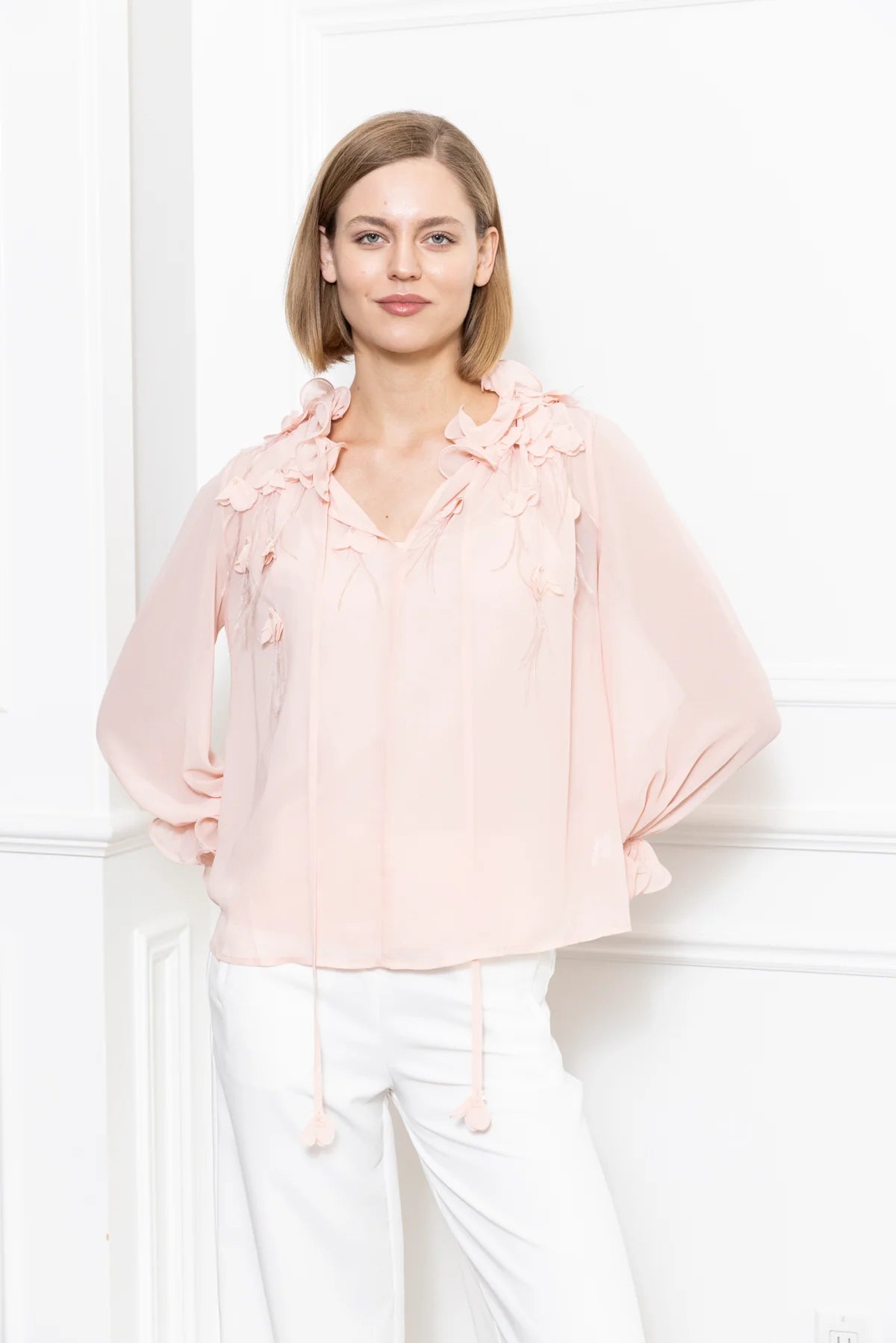The 3D Petals Front Tie Blouse is the epitome of feminine elegance, offering a captivating design that effortlessly combines sophistication and charm. The front tie feature adds a delicate, flattering touch, while the intricate 3D petals gracefully adorn the fabric, creating a sense of texture and depth that elevates the overall look. Crafted from soft, luxurious material, this blouse drapes beautifully on the body, making it perfect for both formal and casual occasions. Its versatile design pairs perfectly with skirts or tailored trousers, offering a refined and graceful silhouette that will make a statement wherever you go. An ideal addition to any boutique, this blouse is a timeless piece that exudes both romance and modern style