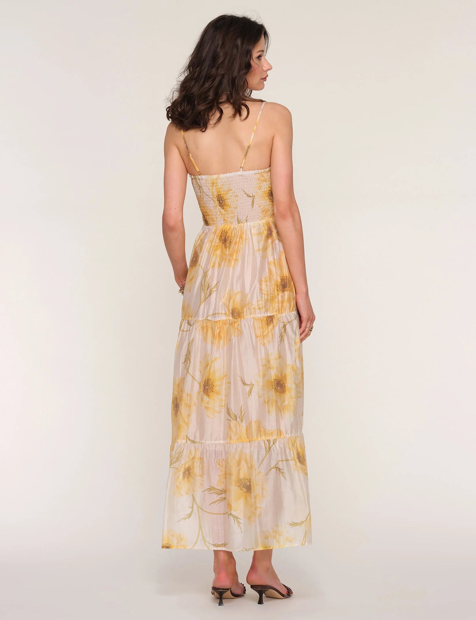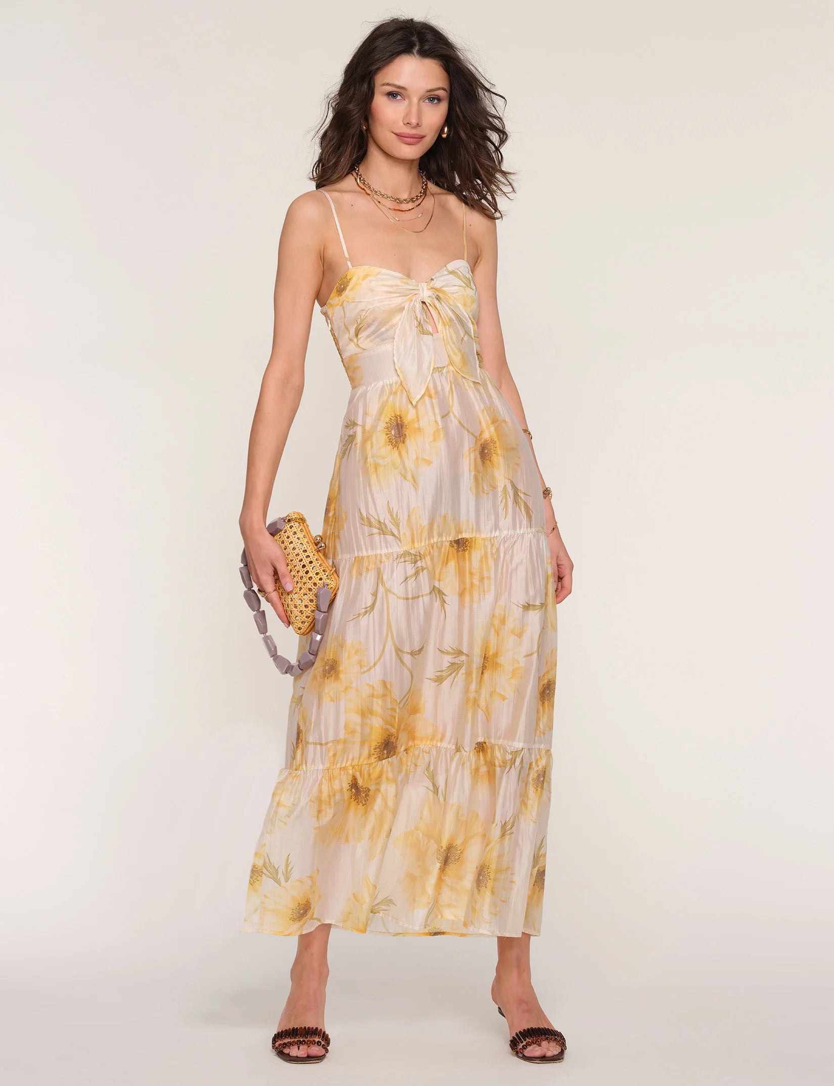 Introducing a picture perfect summer dress, The Ames Dress. Crafted from a printed crepe de chine it has a fitted bodice and a full, tiered skirt. The bow detail adds the perfect touch of femininity to this casually-cool dress