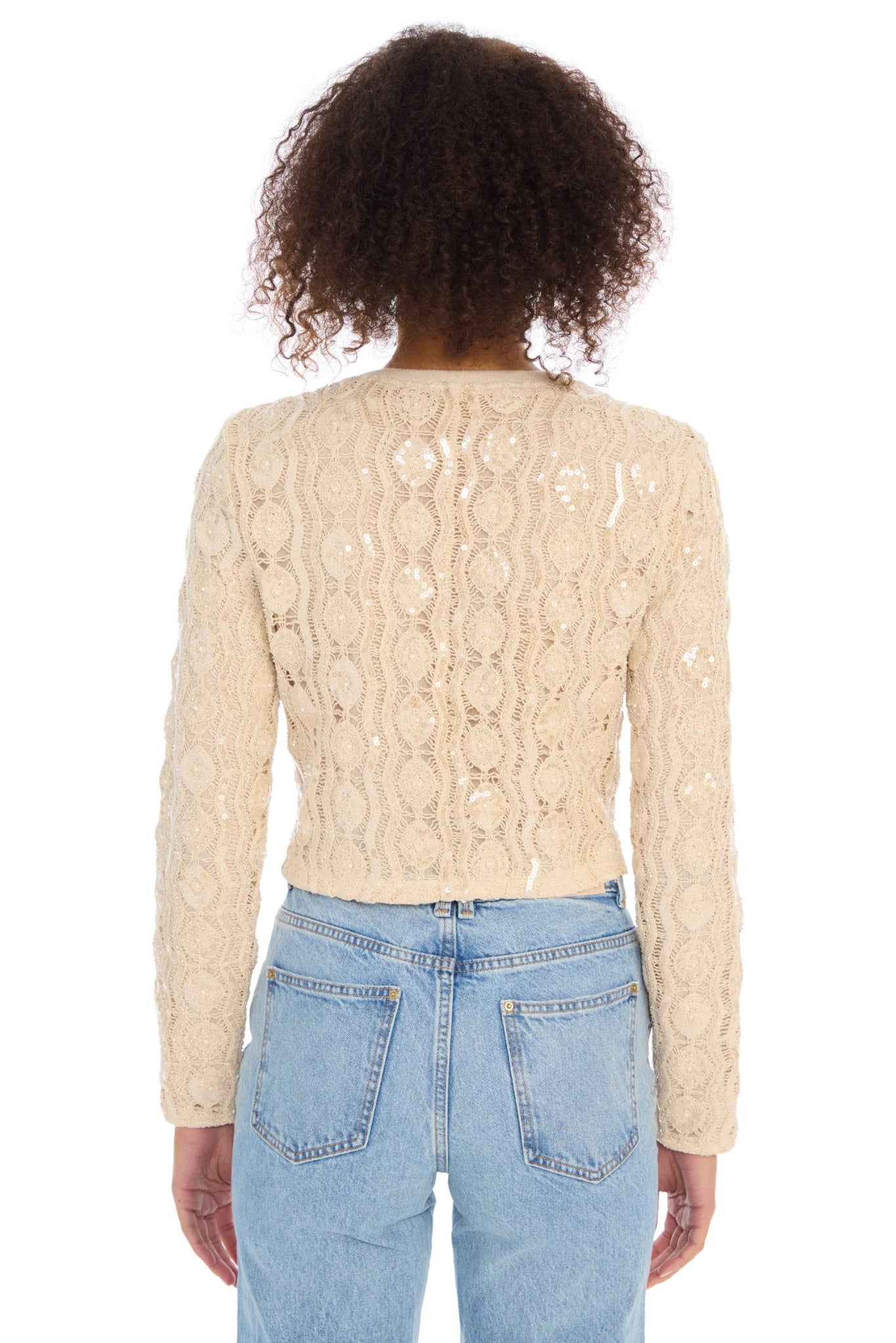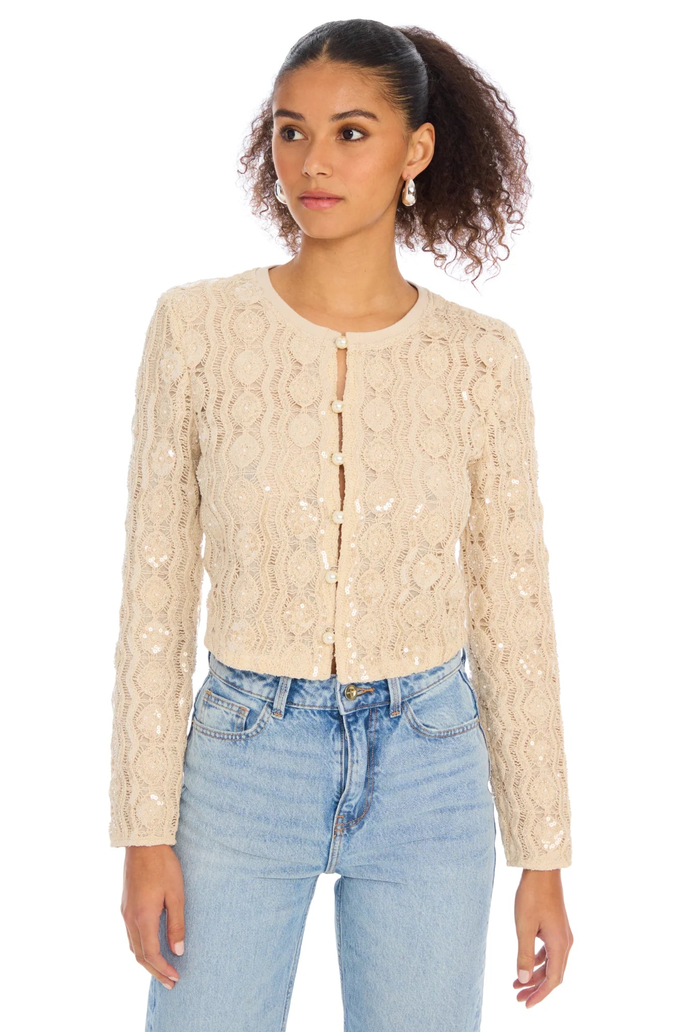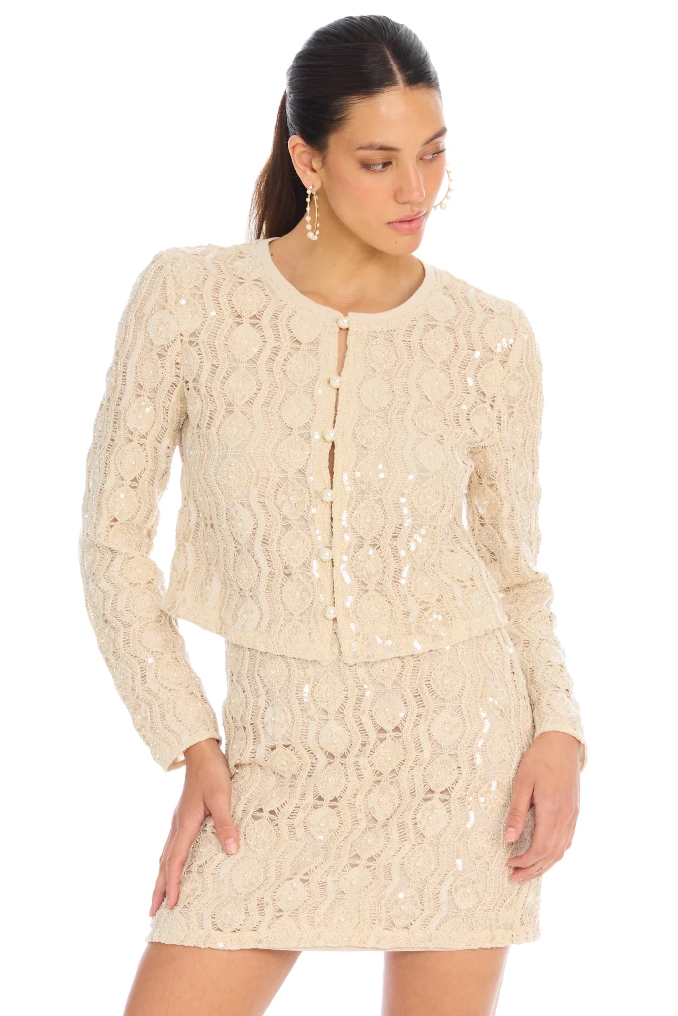 The Beaded Mariana Cardigan features subtle sparkle with sequin and beading throughout the cotton crochet fabrication. Designed with a ribbed scoop neckline, leading to pearl buttons at the center front. The body and sleeves are fully lined. Slim fit through the sleeves. Matches perfectly with the Beaded Dawn Mini Skirt