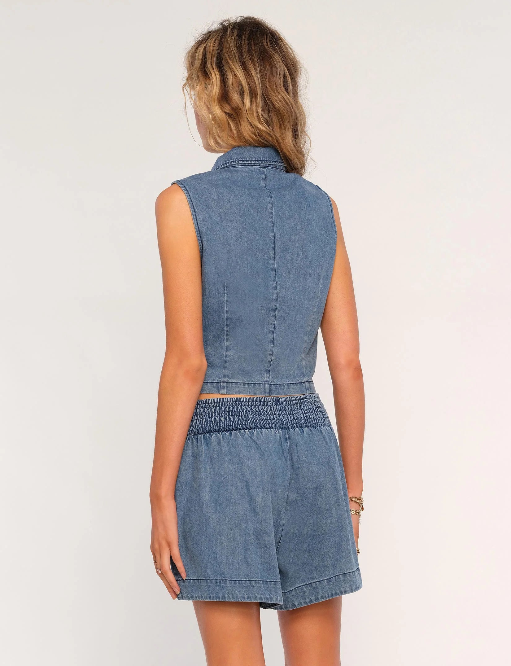 The Bella Set is an easy, everyday outfit. Made from a soft denim it features a relaxed fit top, with side tie, and elastic waist shorts. Pair together or wear as separates for max versatility