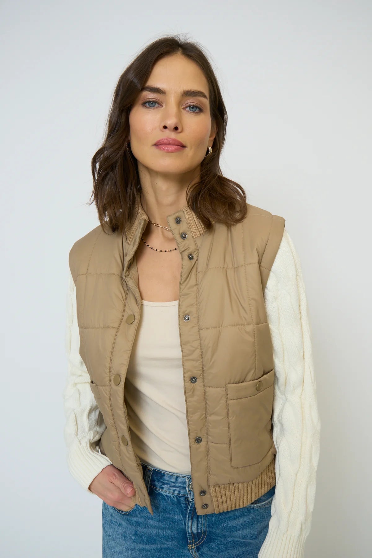 Wrap yourself in effortless style and comfort with our Brady Quilted Mixed Media Jacket. Designed with a luxuriously quilted body and soft knit trim accents, this lightweight layer blends function with flair. The snap front closure makes it easy to throw on and go, while the functional front pocket with flap detail adds a touch of utility and charm. Lightly padded for just the right amount of warmth, it’s perfect for transitional weather and casual layering