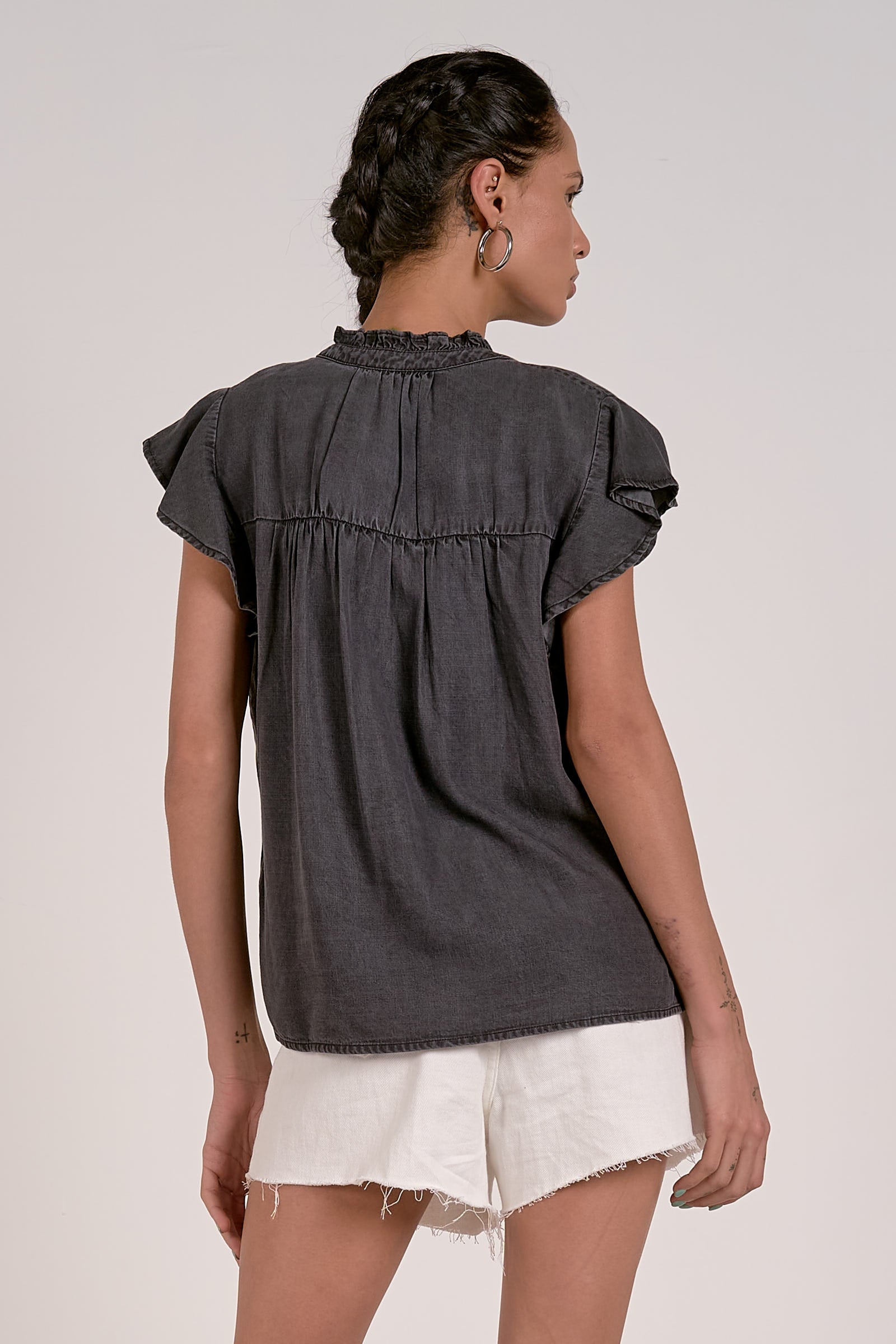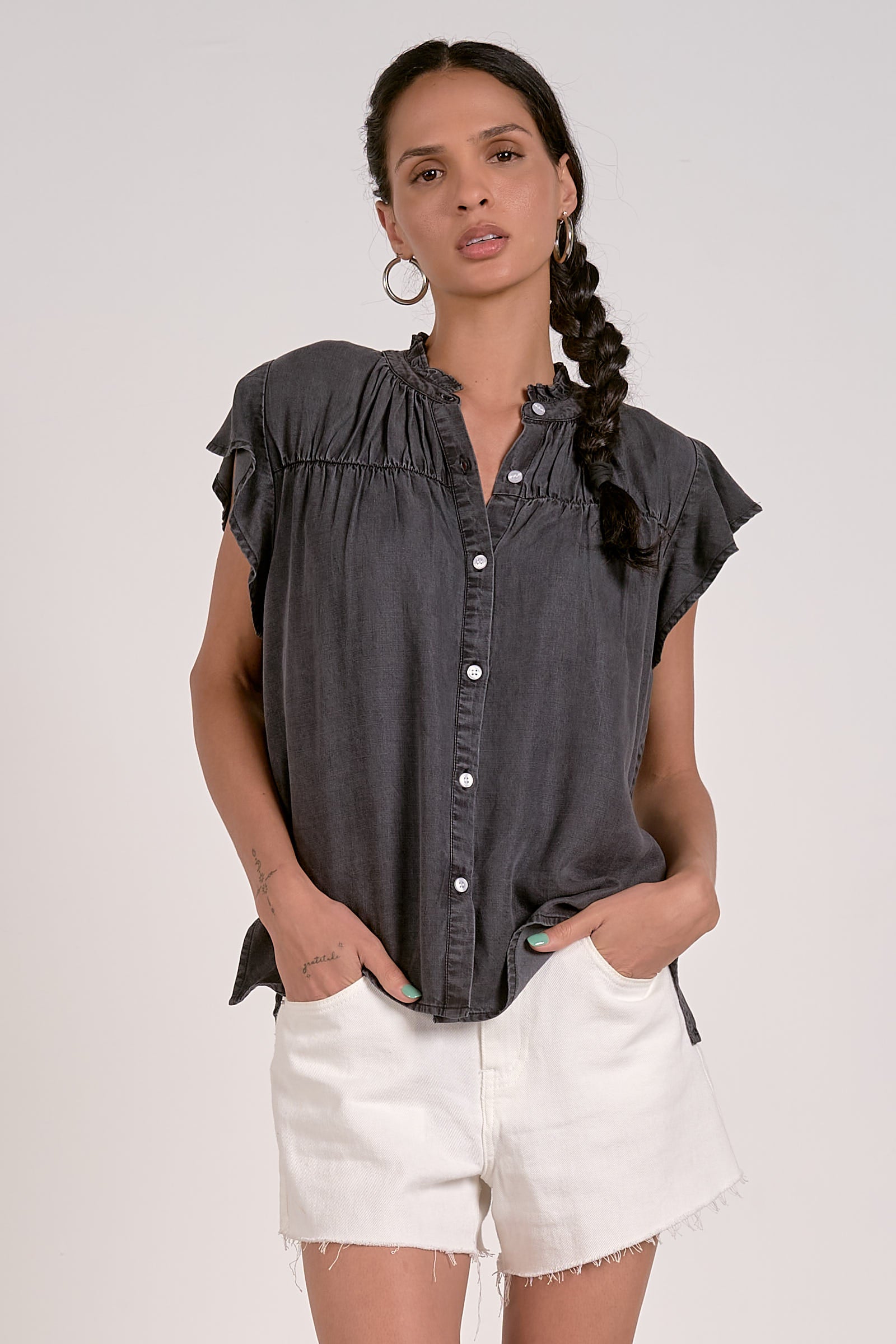 This button-down flutter sleeve blouse is the perfect blend of feminine charm and classic sophistication. Crafted from lightweight, breathable fabric, it keeps you cool and comfortable while adding a touch of elegance to any look. The flutter sleeves give it a soft, airy feel, while the button-down front offers a versatile styling option—tuck it in for a polished look or leave it untucked for a more relaxed vibe. Whether paired with jeans, skirts, or shorts, this blouse is ideal for effortless day-to-night wear, making it a must-have in your wardrobe rotation