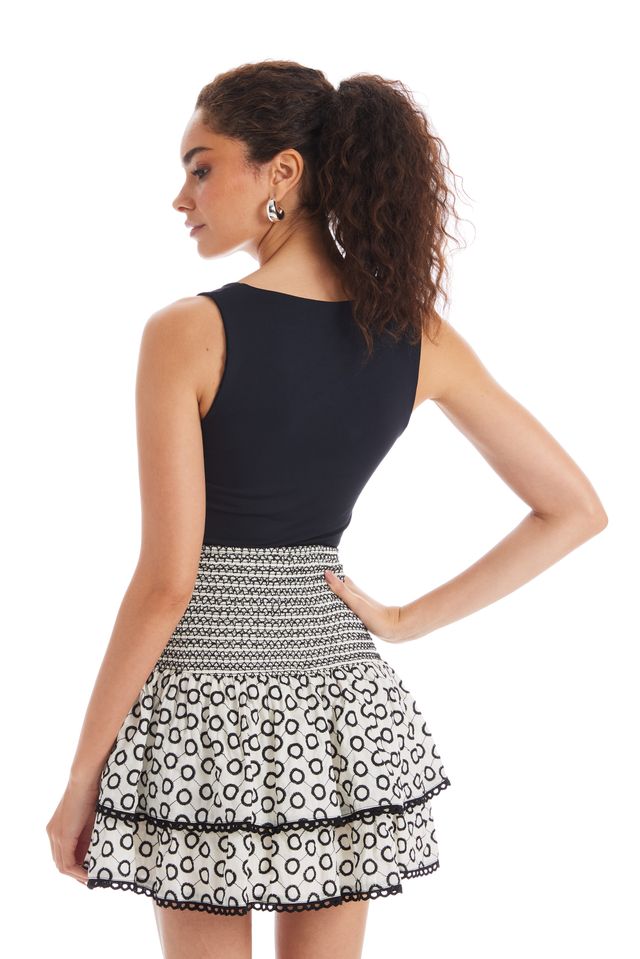The Cleo Mini Skirt is cut in our retro circle embroidered fabrication. Designed with an easy pull on style; the hips are fitted with a contrasting smocked elastic panel leading to 2 crochet trimmed ruffled tiers. Fully lined and mini in length