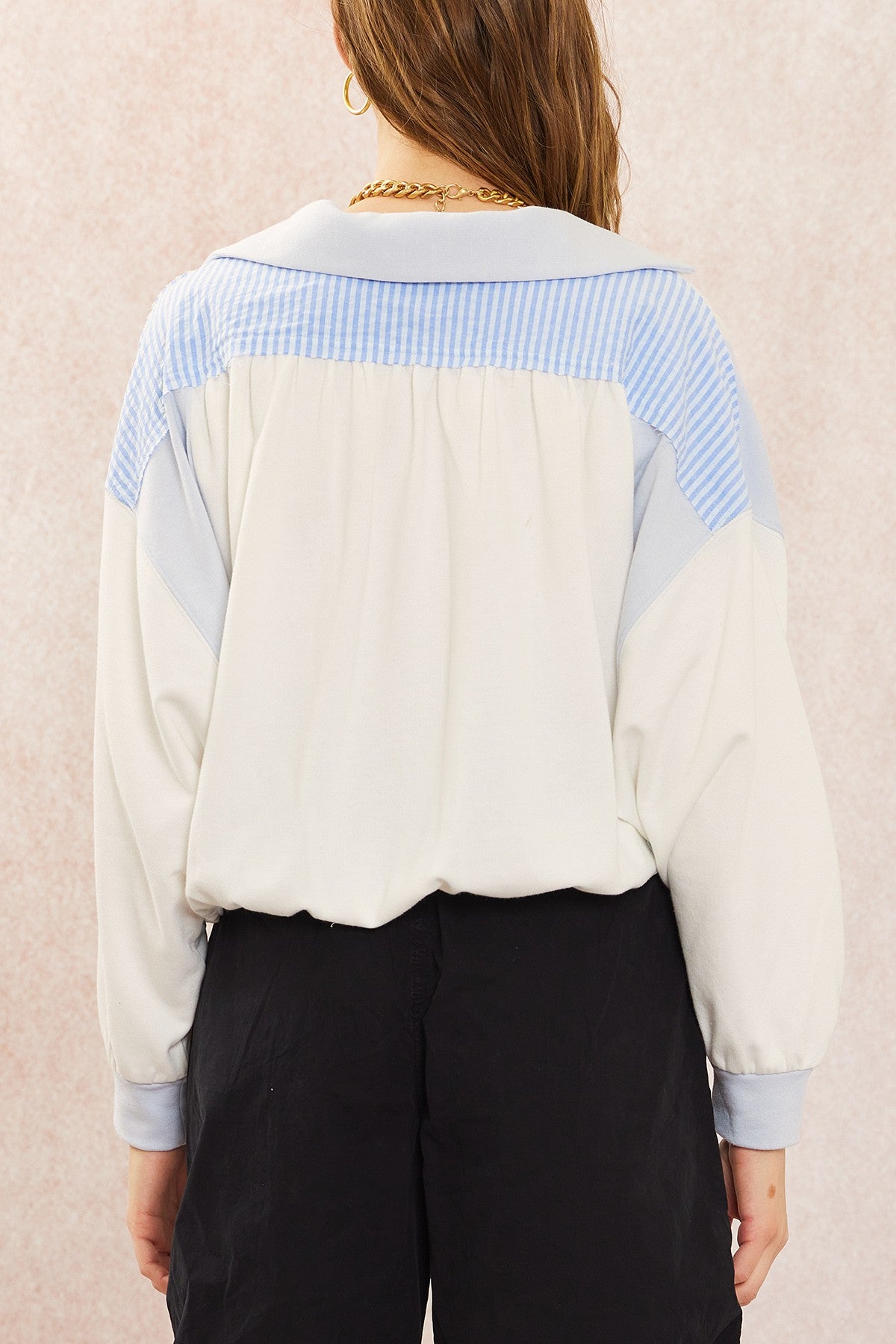 Pair your look with our Cotton Terry Pants. Featuring a mix of cotton terry and striped fabric, these pants offer a slouchy fit, banded cuffs, and a raw hem for a casual vibe. Perfect for easy, stylish comfort