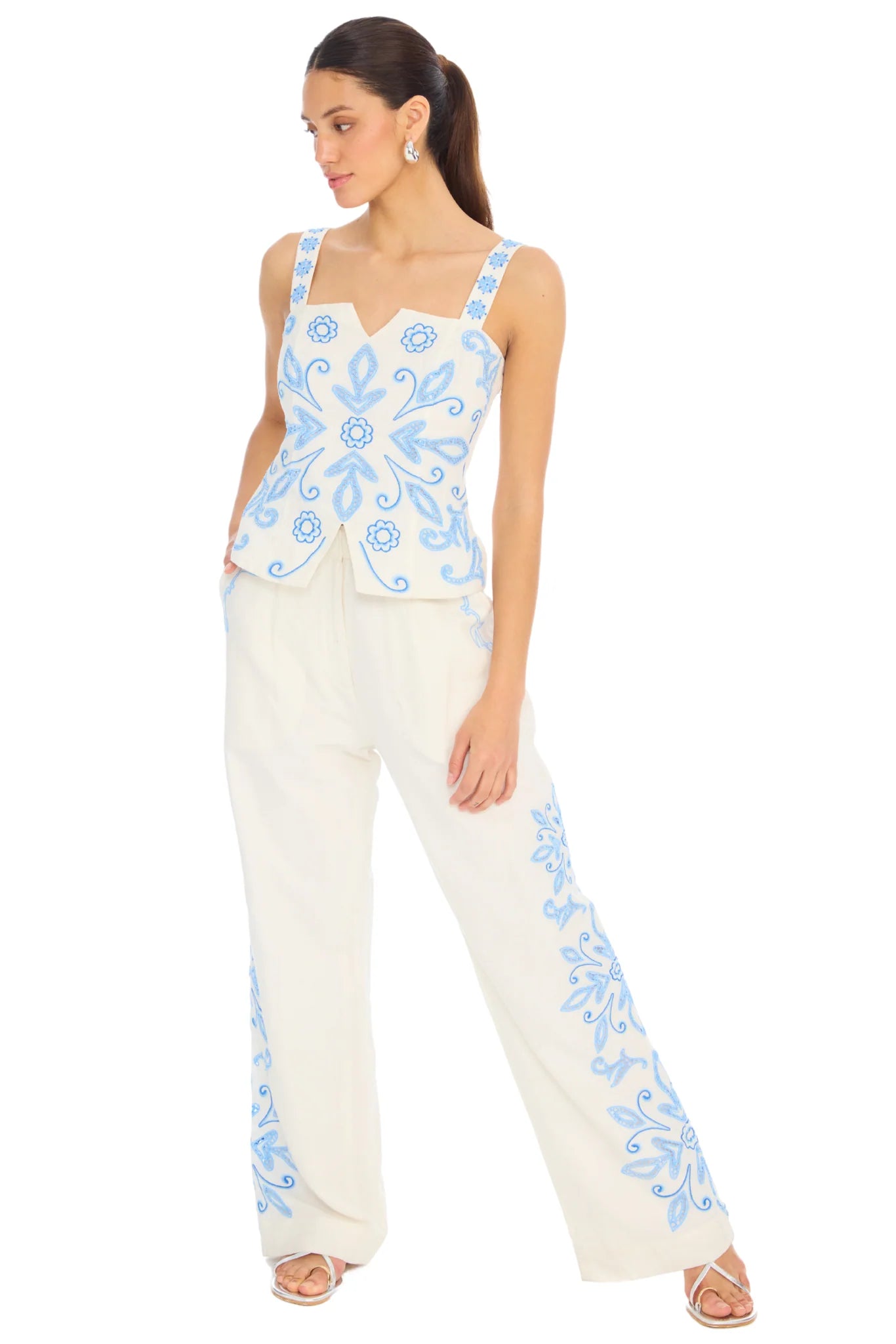 The Cristina Tank is a standout piece fully embroidered in soft blue hues. The structured tank features a split V neckline and princess seaming down the front for added shape. the slightly longer hemline ends in a v cutout at the center front. The embroidered straps are adjustable at the back. Designed with smocking at the back bodice for added comfort and a side zipper closure. Fully lined