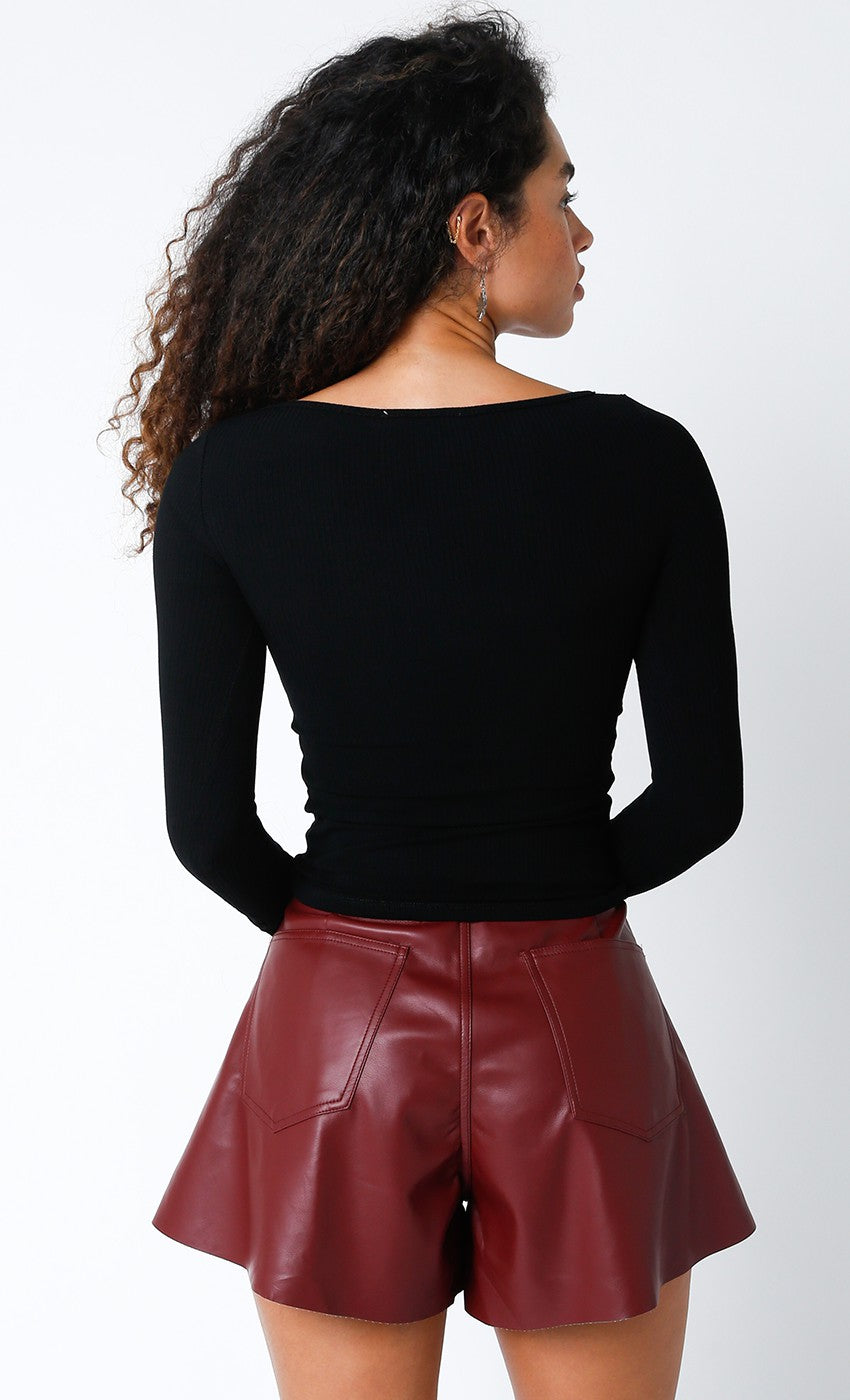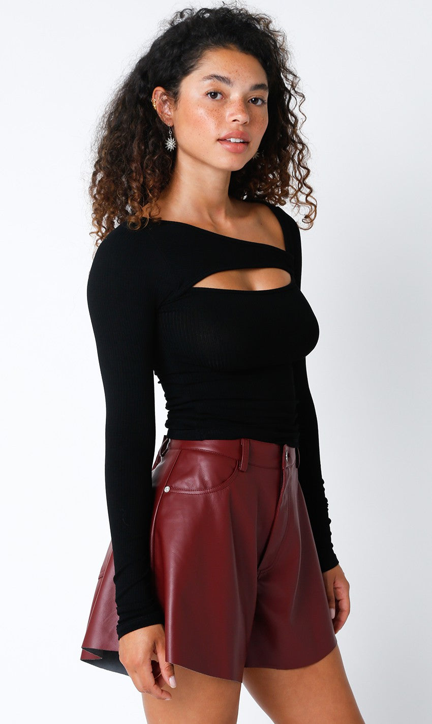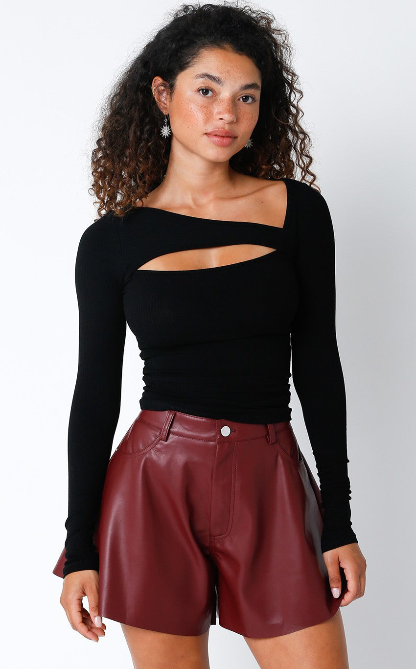 Make a bold statement with the Cut-Out Black Top. Featuring edgy cut-out details, this sleek black top offers a modern and sophisticated look. Perfect for adding a touch of drama to your outfit, whether for a night out or a stylish day look