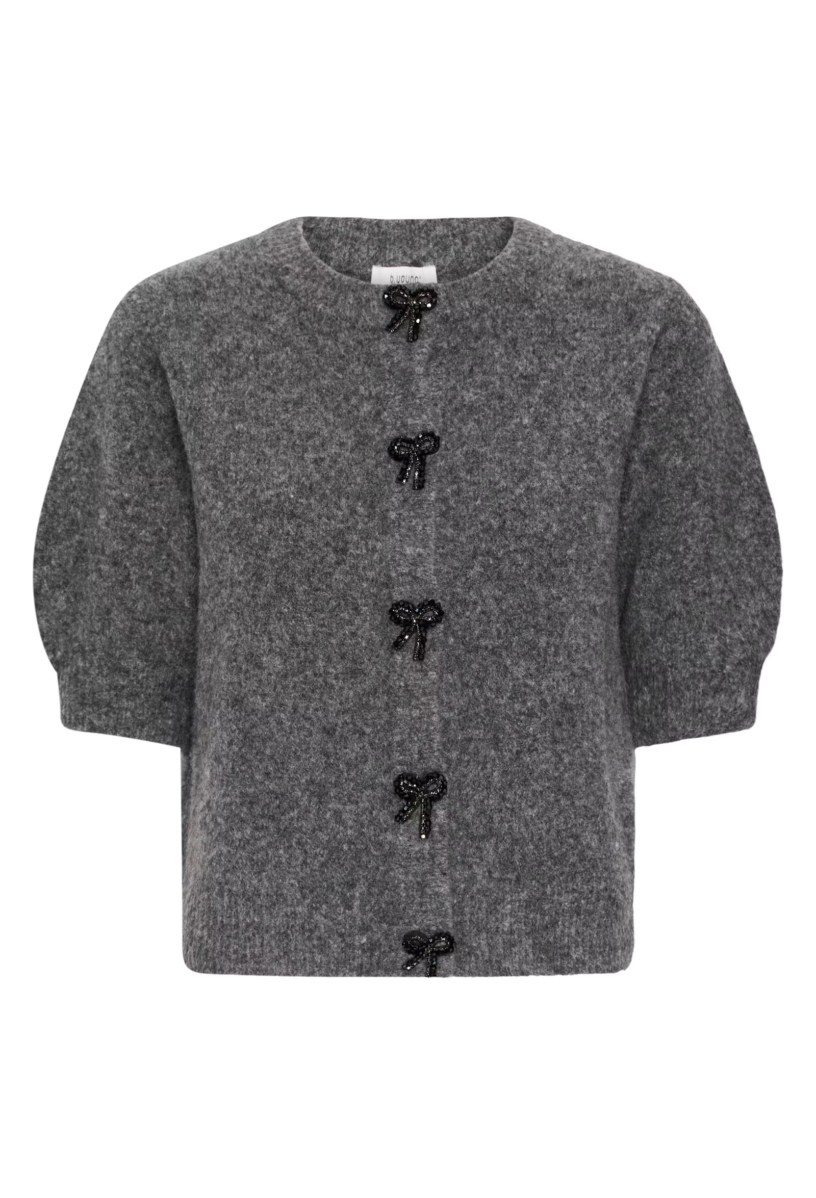 Effortlessly elegant, this relaxed-fit cardigan is the perfect blend of comfort and charm. Crafted from a soft knit for all-day wearability, it features a classic round neckline and flattering half sleeves. Delicate decorative bows replace traditional buttons, adding a touch of feminine flair. Whether layered over a dress or paired with denim, this versatile piece transitions seamlessly from day to night