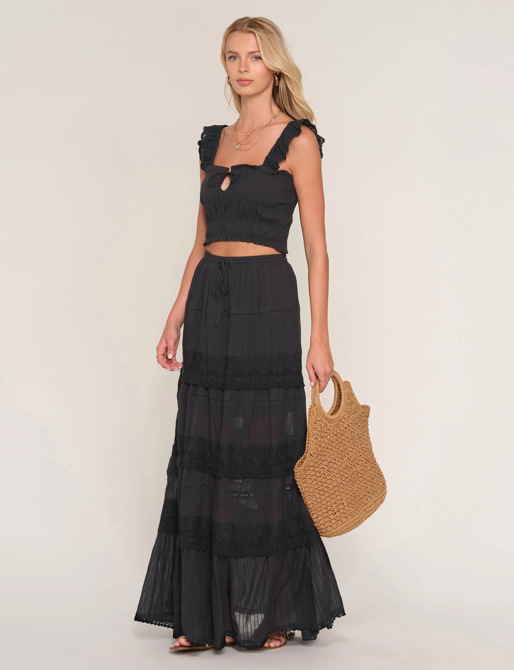 Meet the Dionne Two-Piece Set — the perfect blend of feminine charm and modern elegance. This chic matching set features a flattering crop top paired with a midi skirt, designed to create a polished yet effortless silhouette. Delicate inset lace and eyelet detailing add soft texture and romantic appeal, giving the look a beautifully elevated finish. Lightweight and breezy, the Dionne set is perfect for brunch dates, garden parties, vacations, or any moment you want to feel stylish and confident. Wear the pieces together for a coordinated statement or mix and match with your favorite wardrobe staples for endless styling options