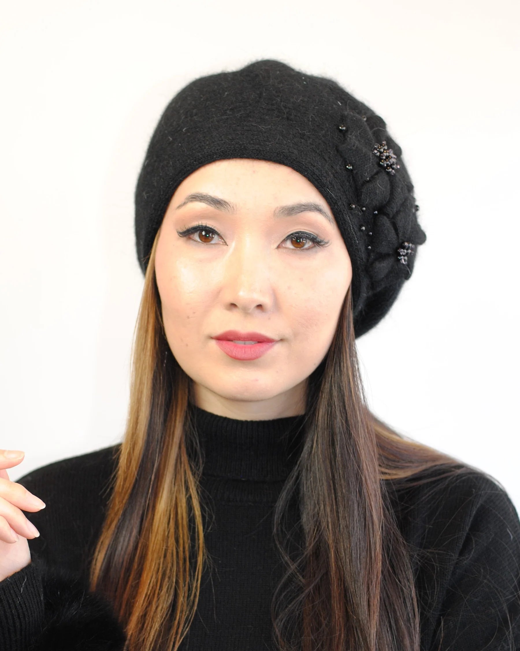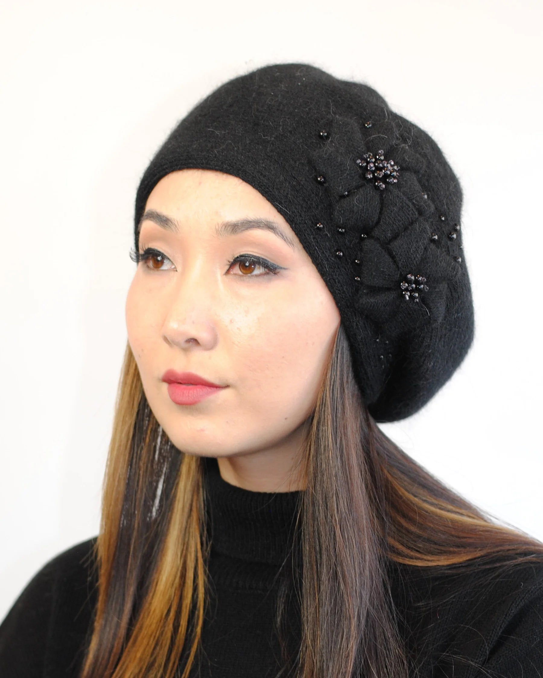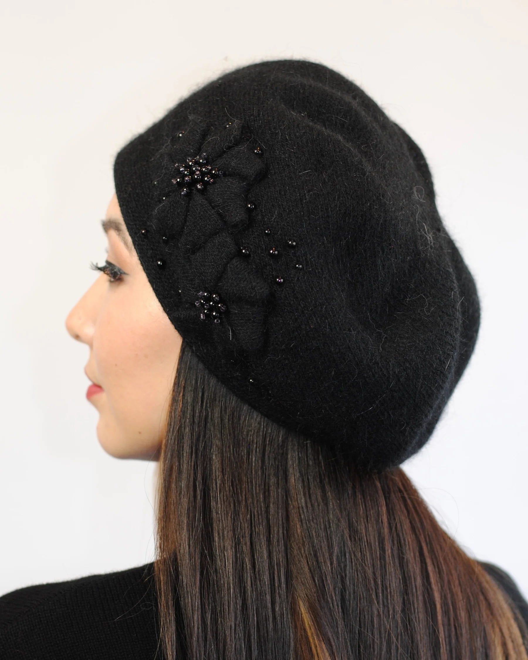 Add a playful Parisian style to any look with this classic beret. Our cozy ANGORA hand embroidered exclusive beret is crafted of super soft angora wool knit with double layer knit for extra warmth accented with a pop of adorable knit flowers and pearl beads lends a luxe touch. This beret is a statement piece inspired by a timeless elegance and femininity. The versatile shape is flattering to most faces and can be styled in various positions: slanted down to one side, pulled down low over ears, or tilted back on the head. The beret will add an opulent touch to any outfit