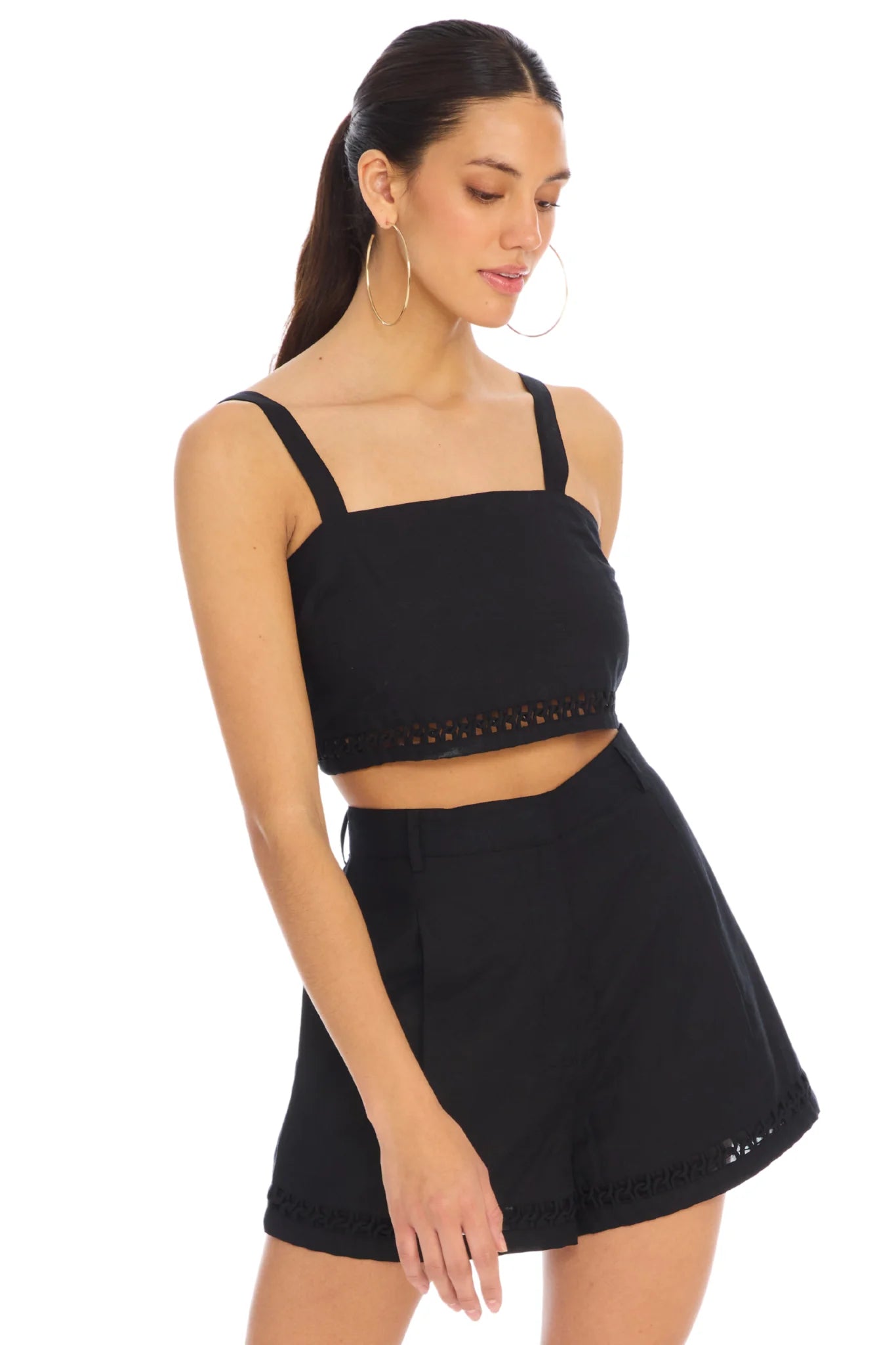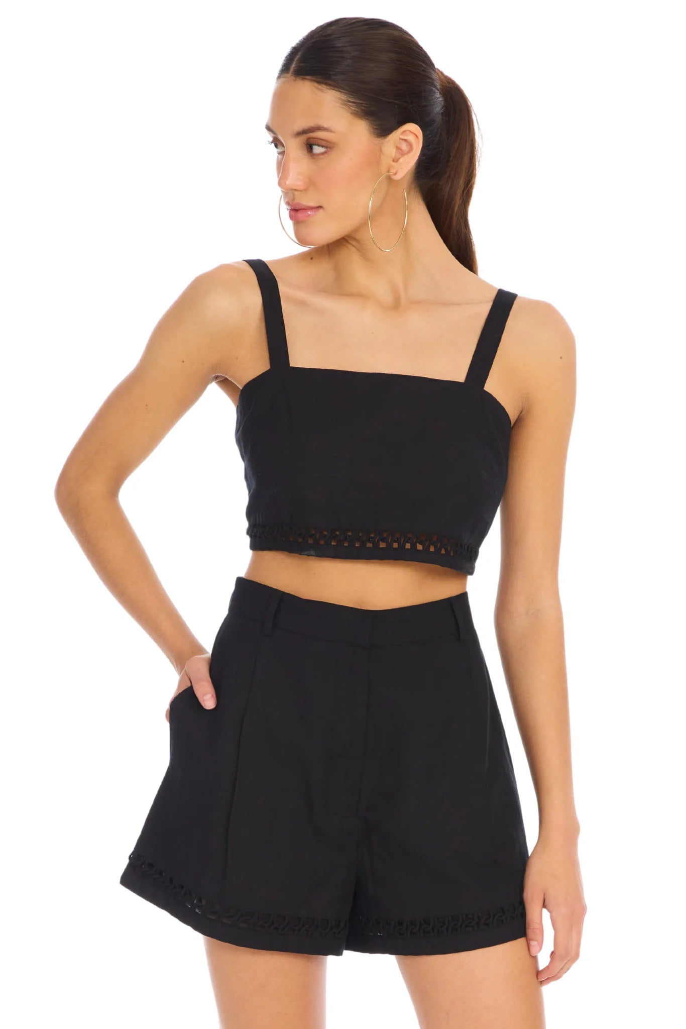 A summer staple: The Elise Shorts are cut in a medium weight cotton/linen blend with a fixed waistband and button/zipper fly front closure. Designed with front pleats for a roomier leg and side pockets. Finished with an intricate basket-weave insert at the bottom hem and fully lined