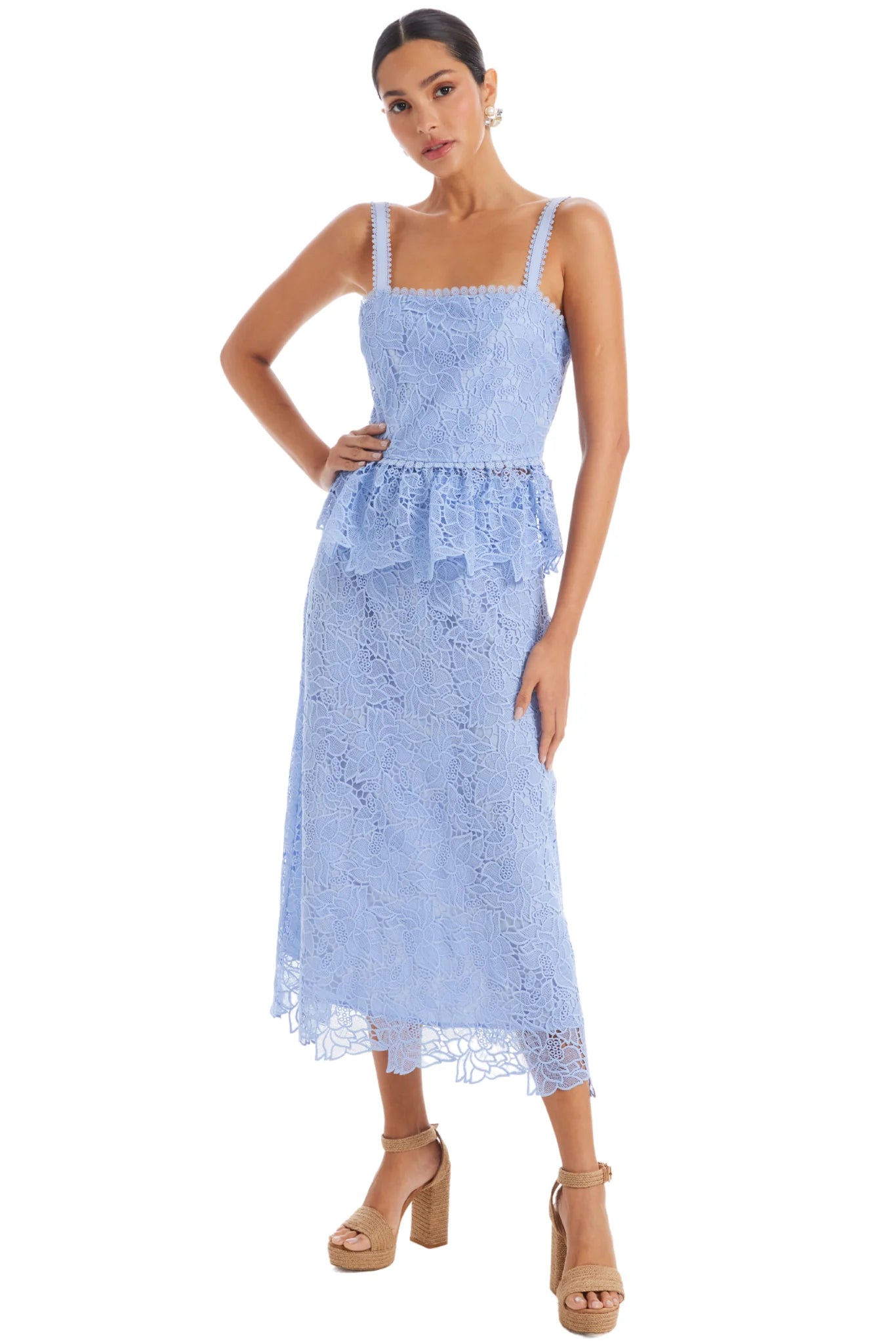The Gina Tank is designed in the floral lace fabrication and features an adjustable strap at the shoulder. Cut with a square neckline, the fitted body features a peplum shape ending in a floral scallop hem. Smocking at the back panel ensures a great fit. Side zipper closure and lined through the body, ending at the waist seam. Peplum is unlined