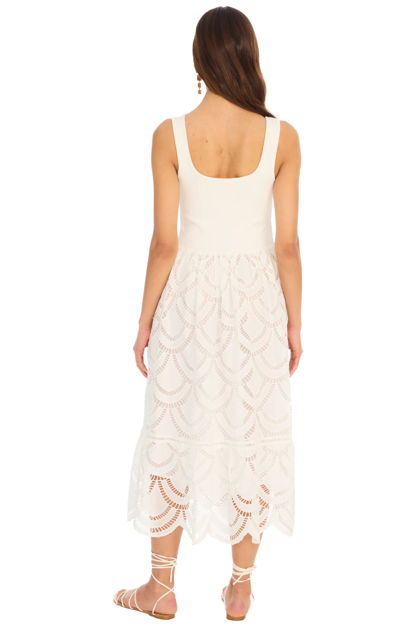The Giselle Dress is the perfect balance of comfort and special detailing. Designed with a bra-friendly square neckline; the bodice is cut in a double layered ribbed knit for added coverage. The stretchy elastic V shape waistline leads to a gathered full skirt with side pockets, cut in a dramatic cotton eyelet fabrication. Fully lined