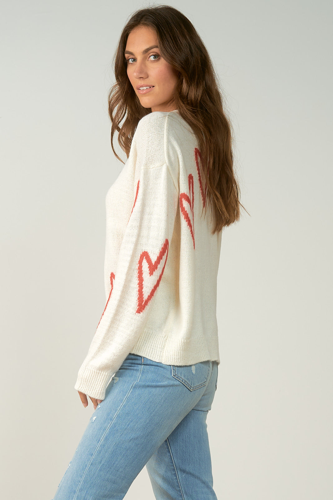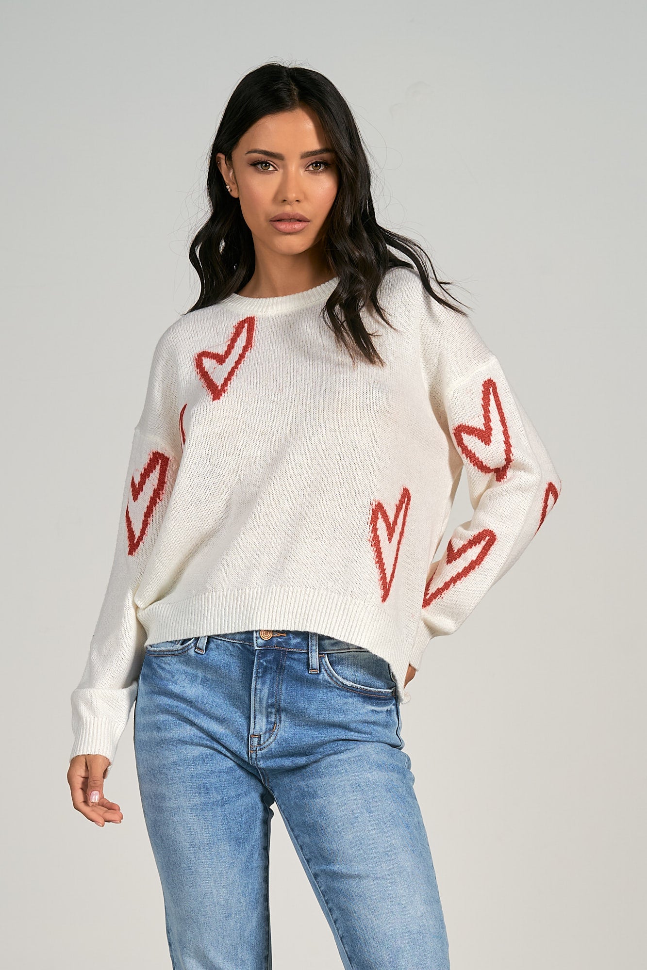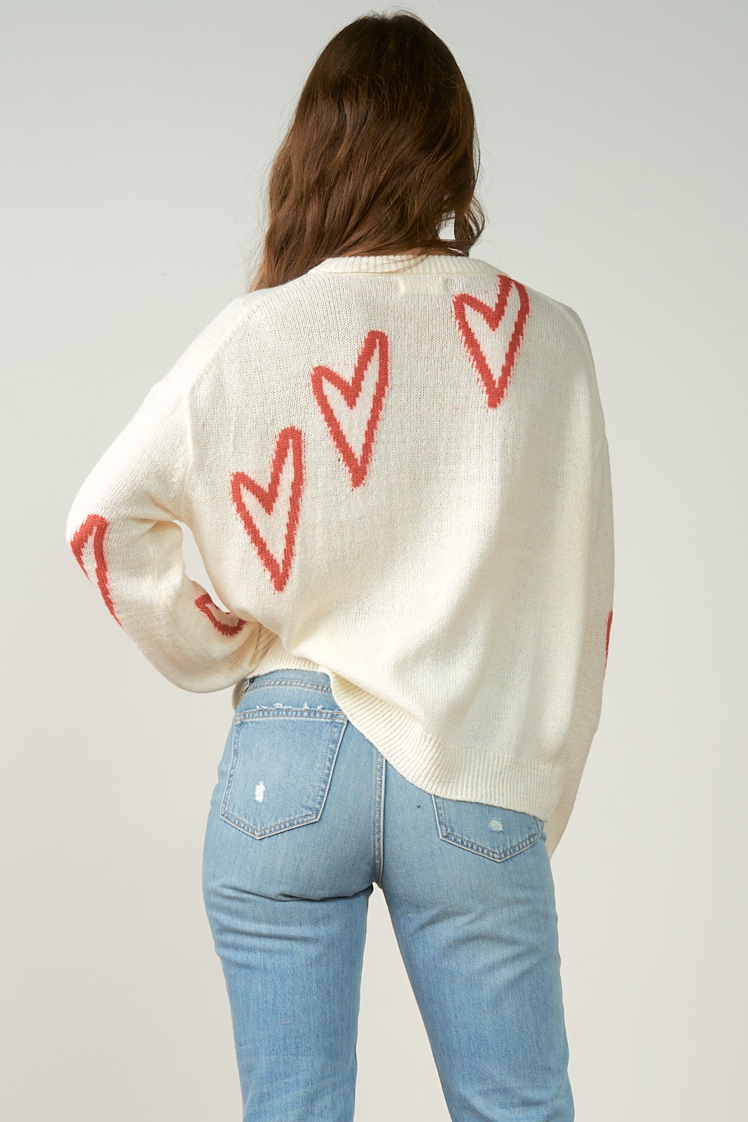 This adorable white sweater, featuring sweet heart details, is the perfect piece to embrace the cozy, romantic spirit of Valentine’s Day. Made from a soft, snug fabric, it combines comfort and charm with its playful heart-shaped accents, creating a fun yet stylish look. The relaxed fit and classic crew neckline make it ideal for layering or wearing on its own, while the soft, breathable knit ensures you stay warm and comfy all day. Whether you're celebrating the season of love or just want to add a touch of whimsy to your wardrobe, this sweater is a delightful choice. Pair it with jeans, skirts, or even cozy leggings for a laid-back yet festive look that’s sure to turn heads
