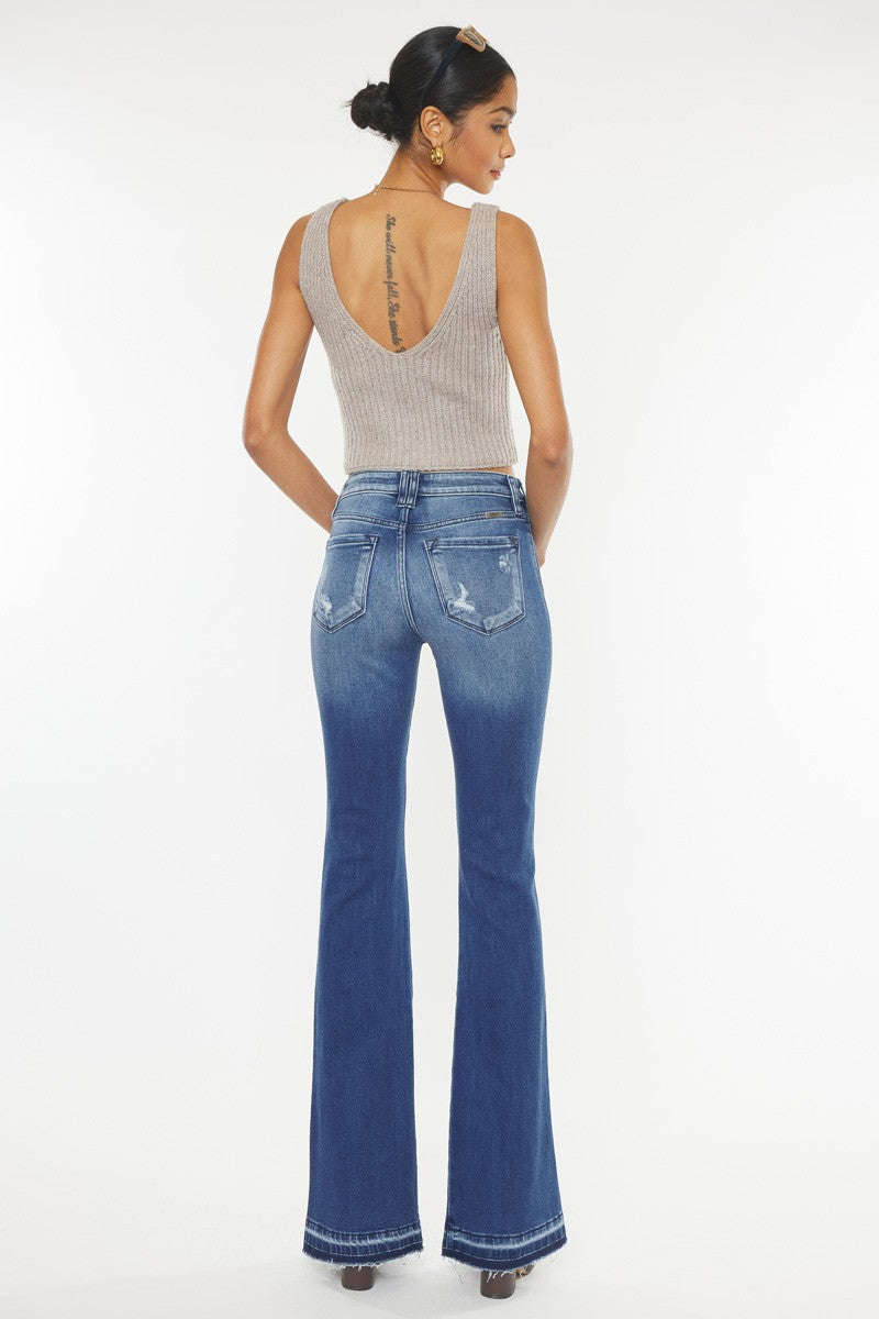 High Rise Flare Jeans are the perfect pair of trendy flare jeans with medium distress, medium fading, and whiskering. Comes in soft buttery stretch denim that melts to your every curve up to the knees where it flares out to the bottom. Features a classic 5 pocket style, front button closure, and zip fly