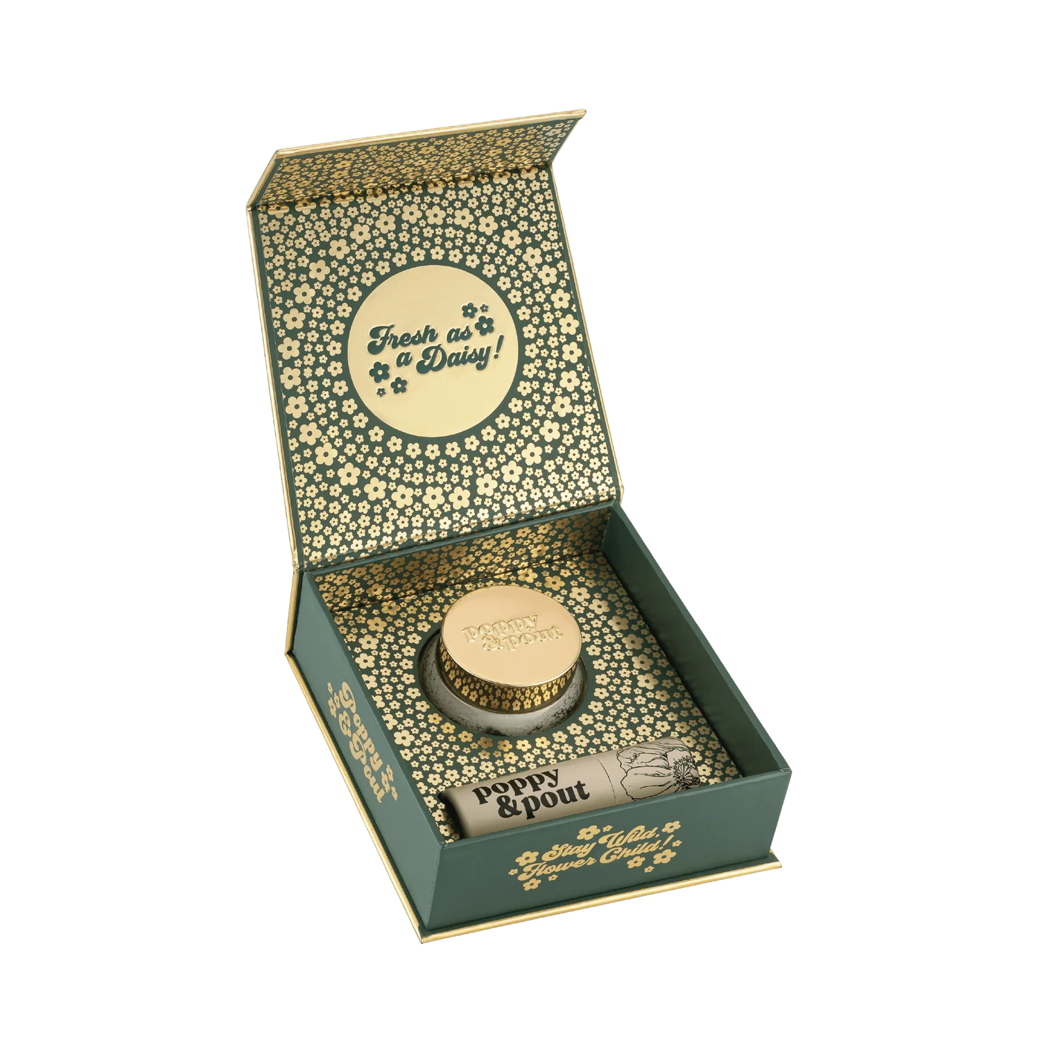Step up your lip care routine with our Lip Care Duo! This gift set includes one matching lip balm and lip scrub in a beautiful (newly updated!) green and gold, recyclable gift box.