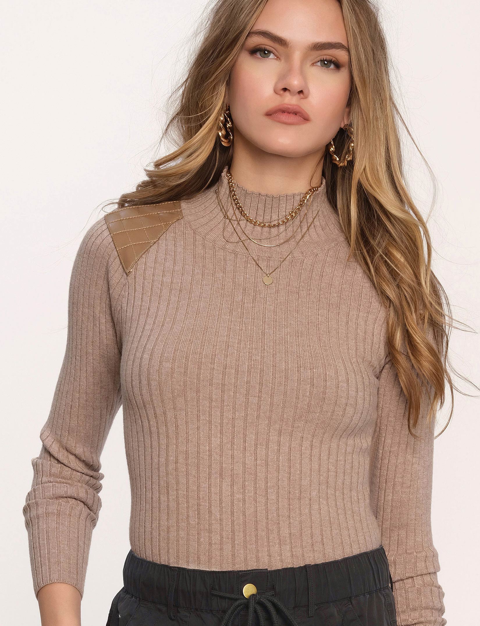 The Kenna Sweater is made from a soft, lush, ribbed knit with contrast quilted, faux leather shoulders. It has a mock neck and a slim fit. Tuck it into a skirt or wear it with jeans