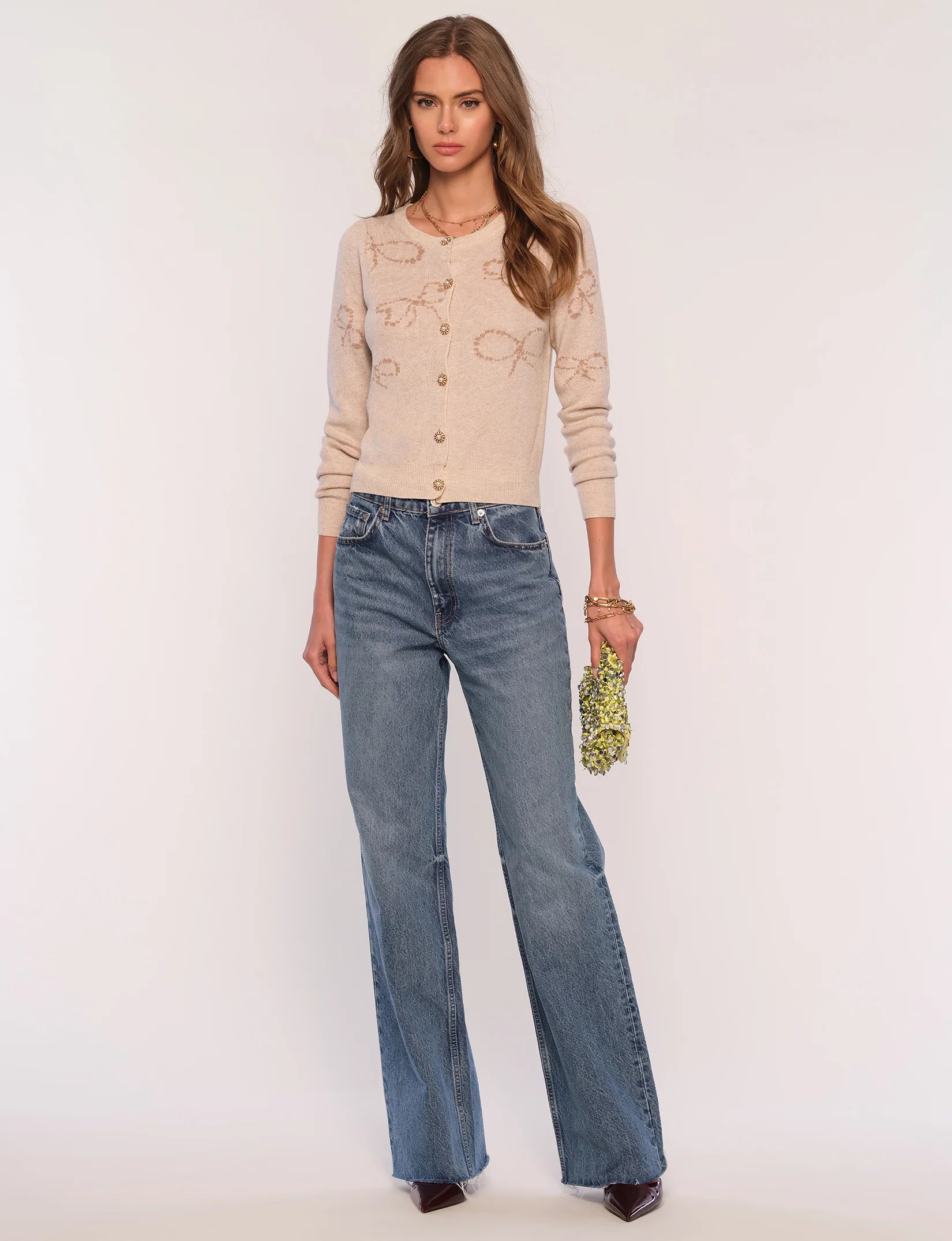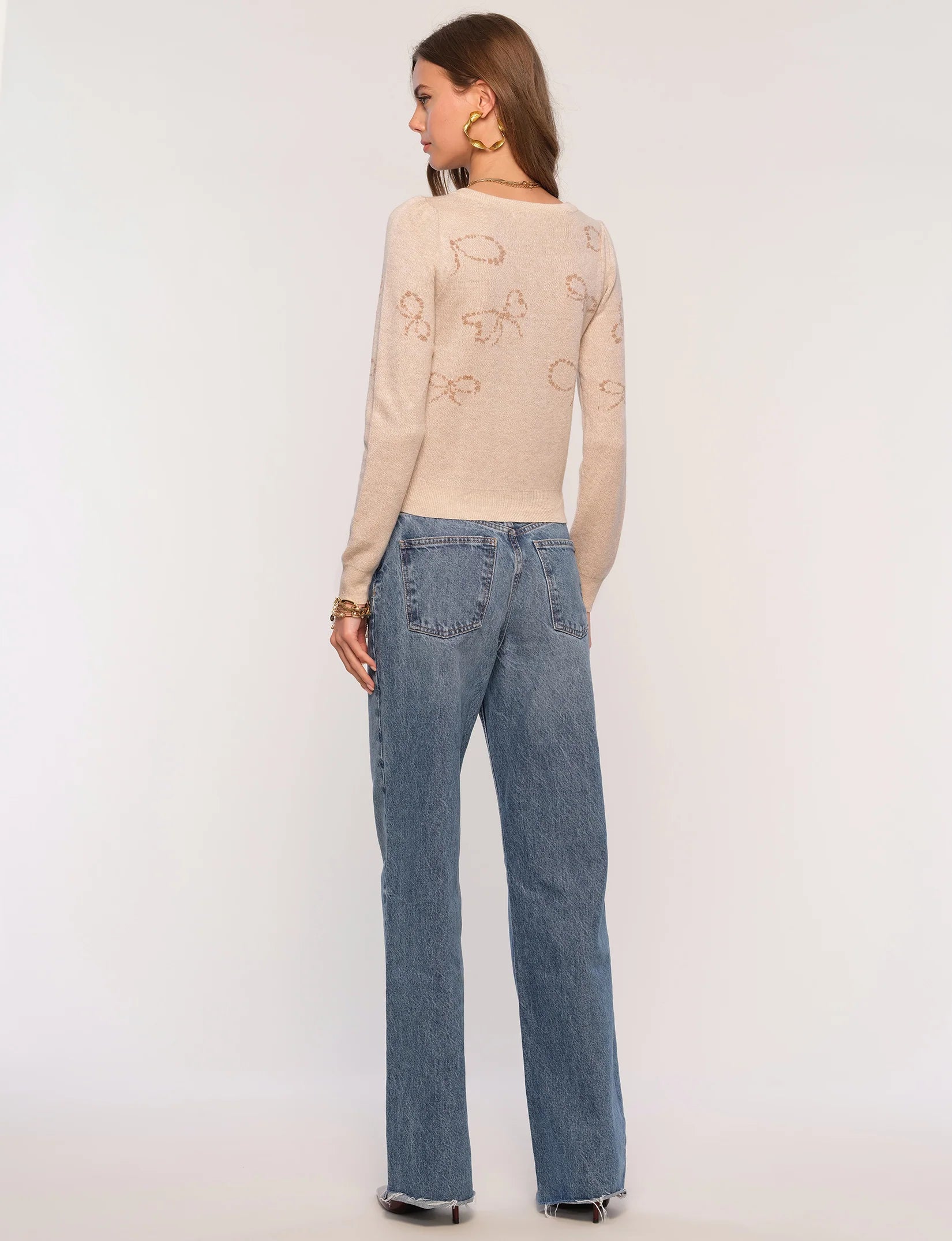 The sweetest cardigan ever…the Linden Cardi. It is knit from a soft, melange yarn and features a bow pattern throughout. It is adorned with novelty buttons for extra flair