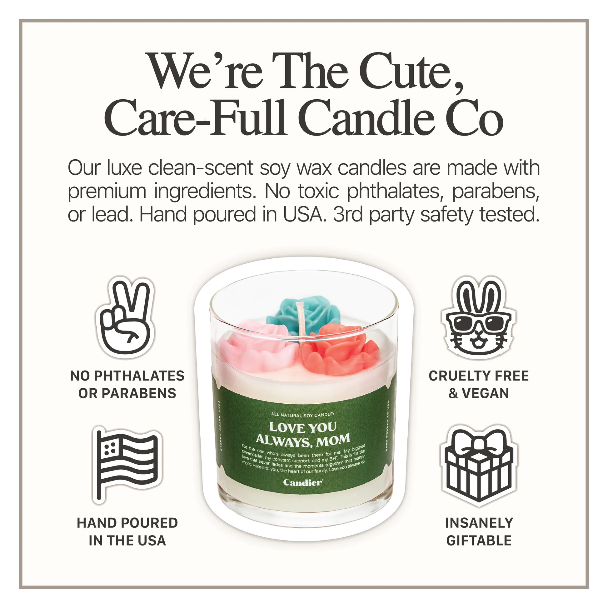 Candier is a Cute, Clean & Care-Full Candle Co™. They make luxury candles the right way. Candier uses premium ingredients, with no phthalates, no parabens and no lead (like most other candles on the market). Amazing, dedicated candle makers hand pour all the candles in the USA, and use the highest quality materials that are always cruelty free.