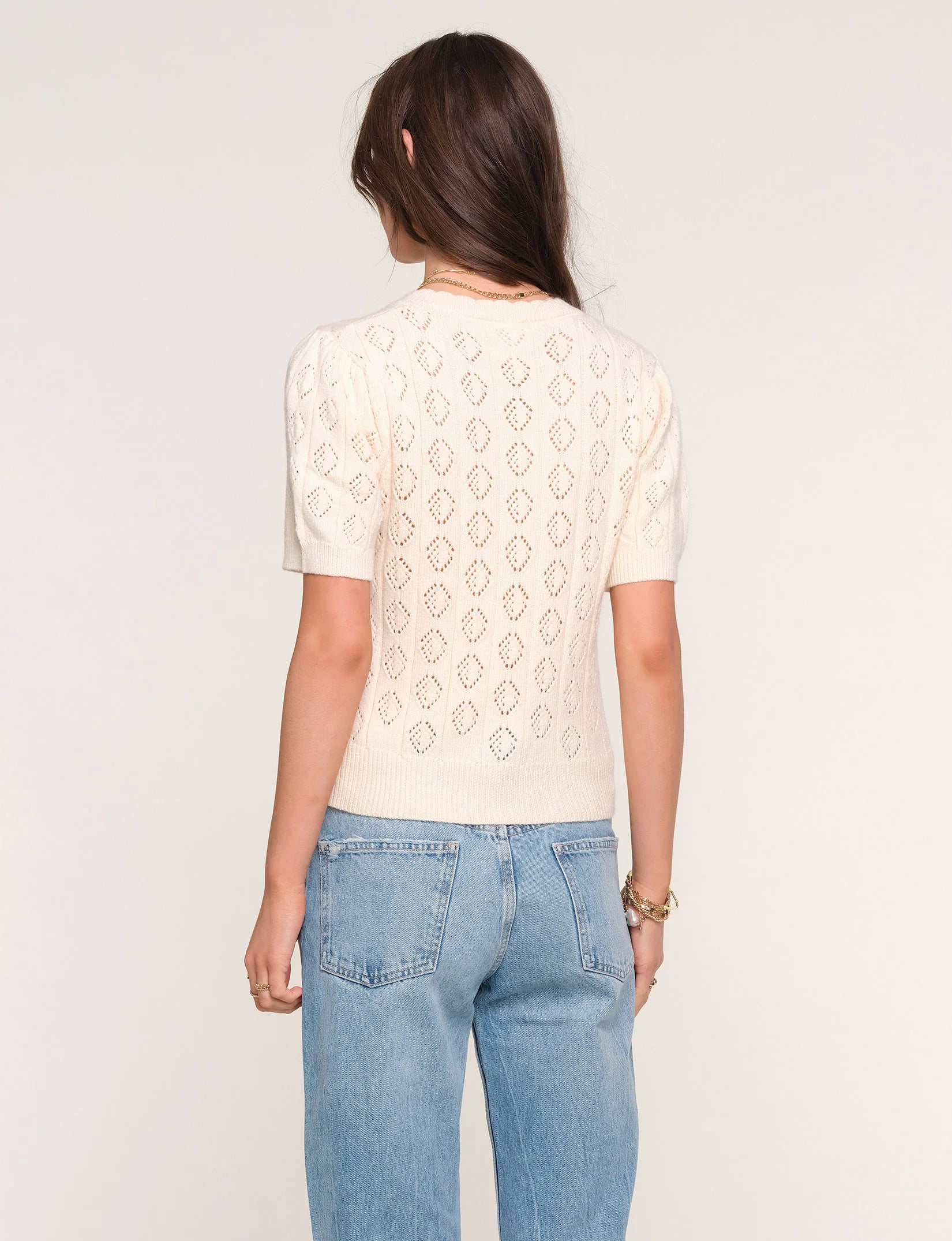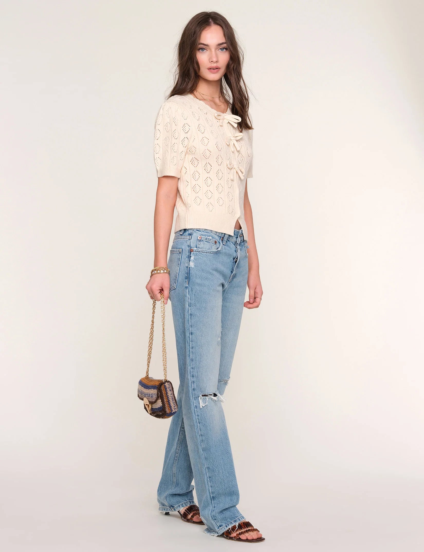 In a lightweight yarn, The Mae Cardi, is a cool, crew neck cardigan. It features an all over pointelle design and self bows at the front