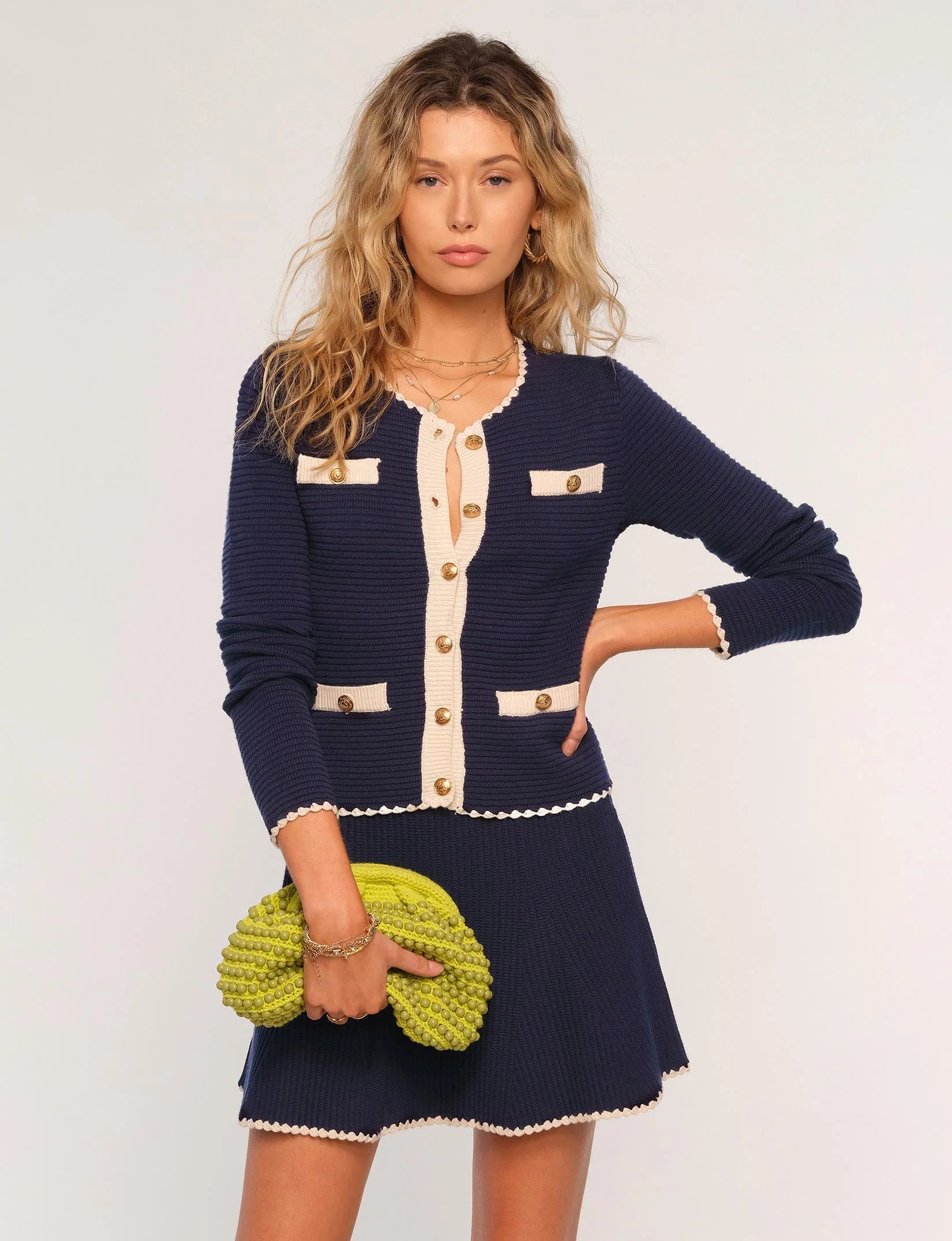 The Makenna Set is the set of the season. Perfect for transitioning into spring, it can be worn together or seperately. It features contrast tipped edges and pockets, and brass novelty buttons. This set is a no brainer for the season