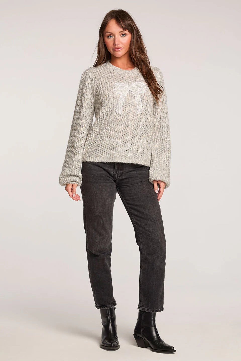 The Margow Sweater blends effortless elegance with a hint of charm. Crafted from a soft grey knit, it features slouchy sleeves and a high neckline that create a relaxed yet refined silhouette. A sweet knit bow detail at the front adds an unexpected, playful touch of whimsy, elevating this cozy essential into something truly special. Perfect for dressing up or down, the Margow Sweater is a delightful, sophisticated addition to any boutique wardrobe