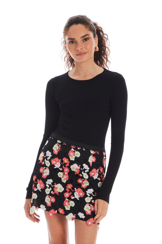 The Martina skirt is designed in fully custom lace with a subtle pop of color. Designed with a fitted shape throughout and a fixed waistband that closes with a zipper in the back