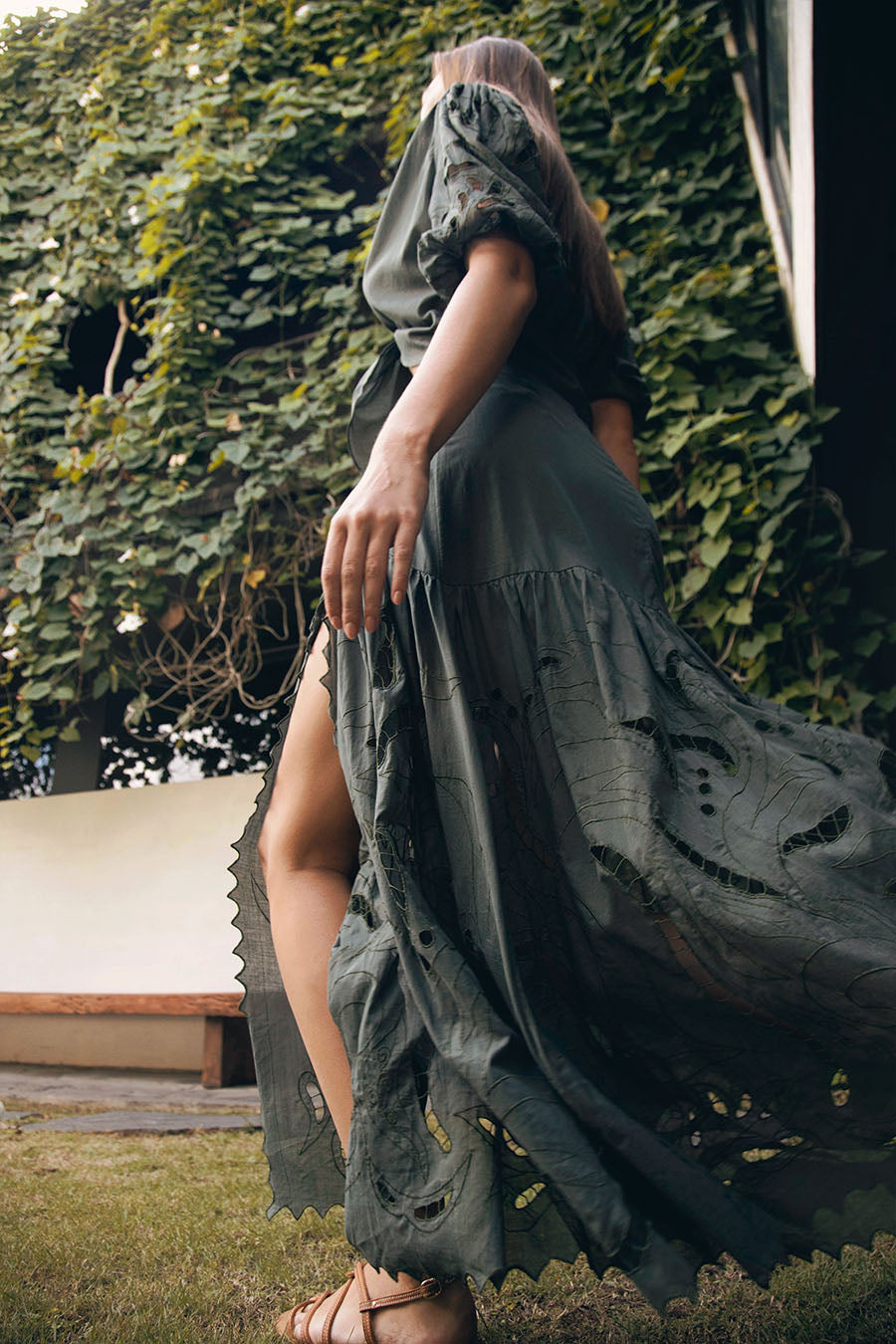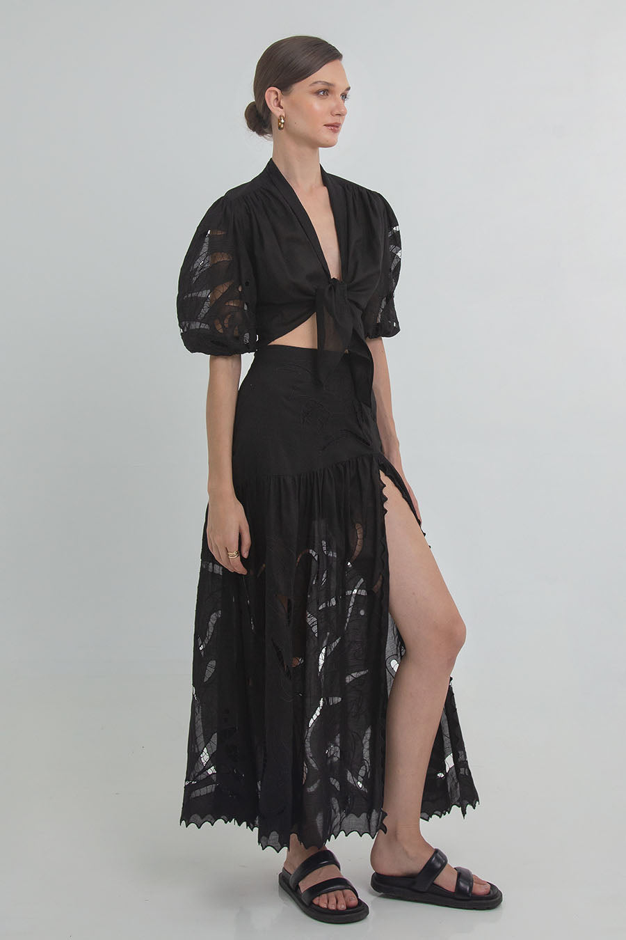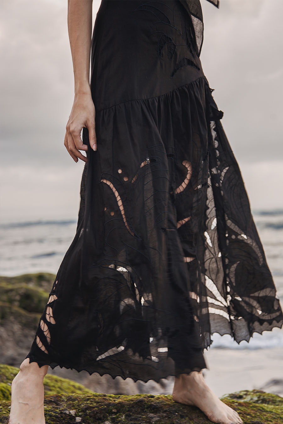 Crafted in cotton, our Maxi Skirt features a unique leg split design adorned with exquisite Balinese cut-out hand embroidery throughout. Elevate your style effortlessly blending traditional artistry with modern fashion