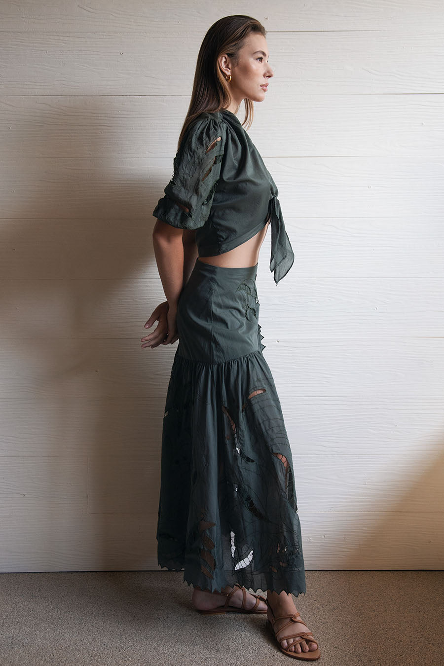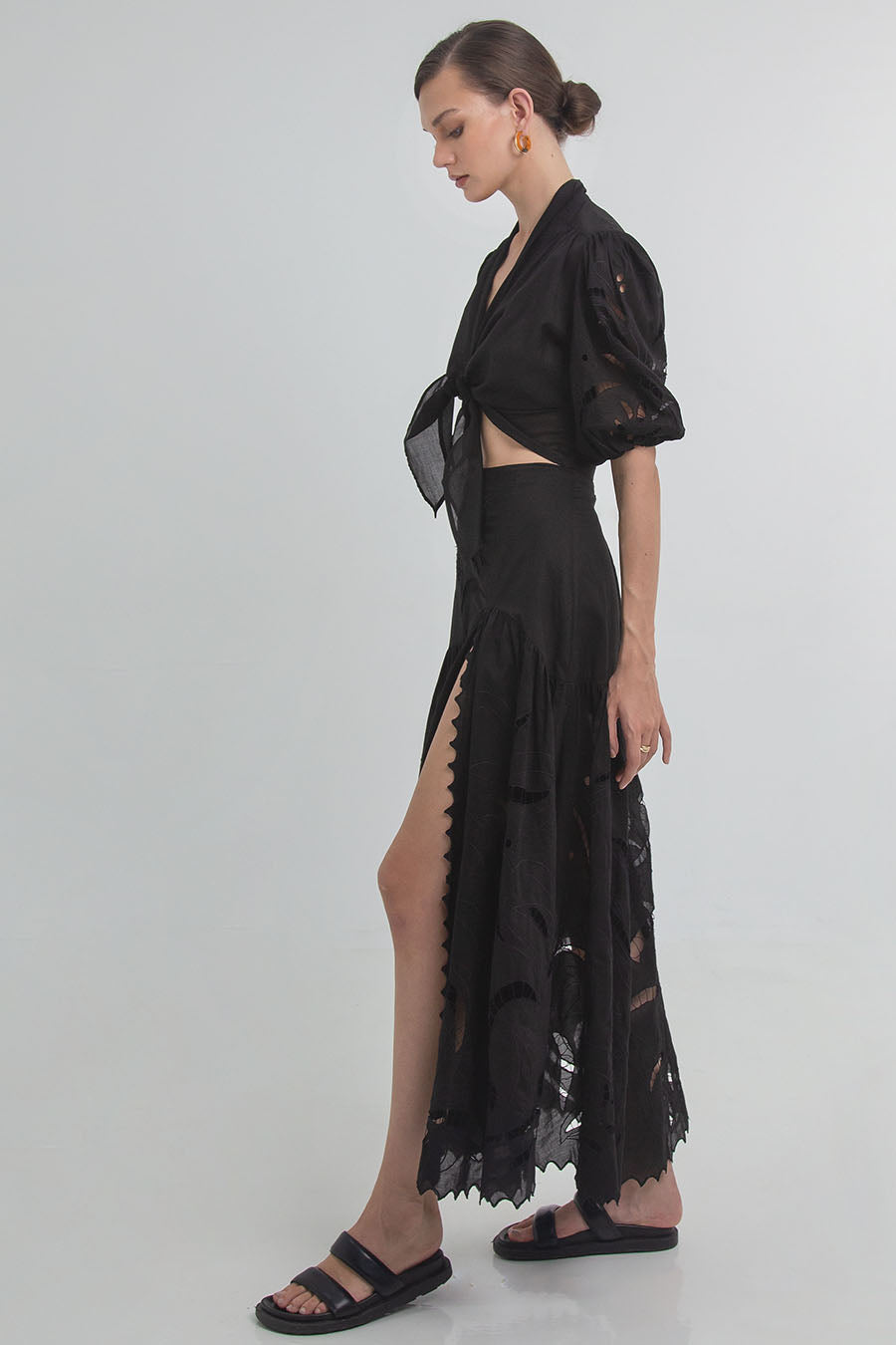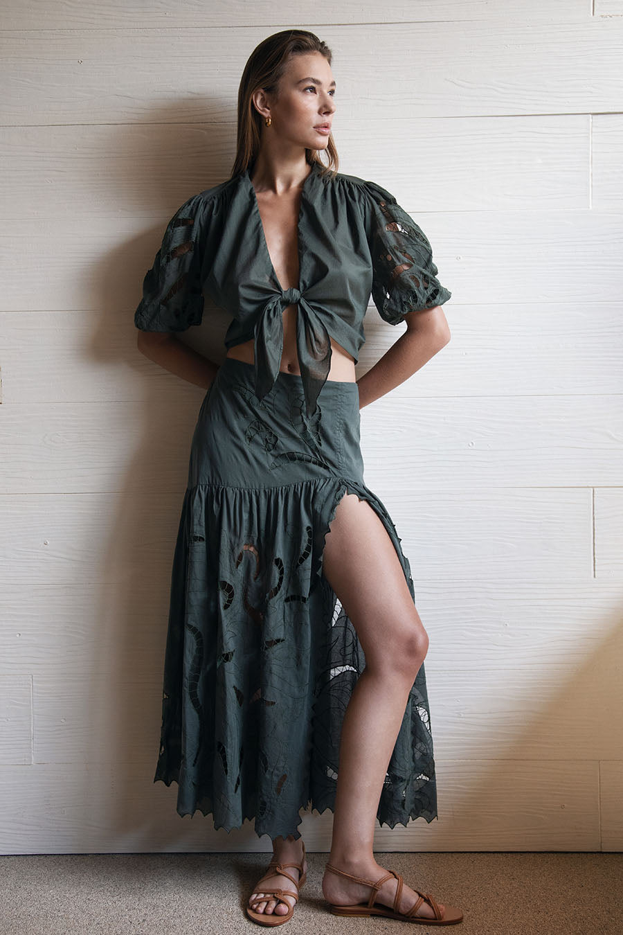 Crafted in cotton, our Maxi Skirt features a unique leg split design adorned with exquisite Balinese cut-out hand embroidery throughout. Elevate your style effortlessly blending traditional artistry with modern fashion