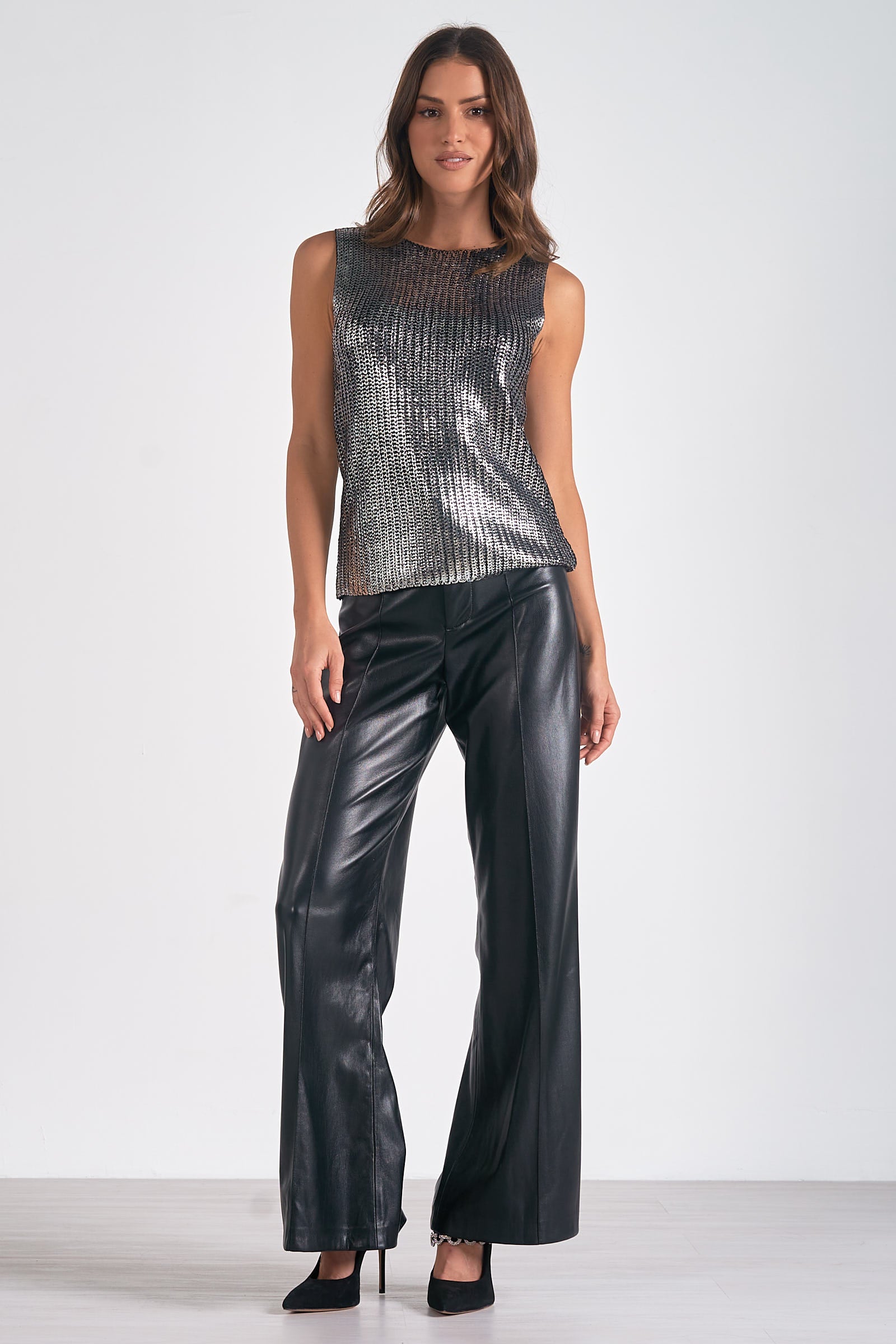 This metallic sweater tank exudes contemporary elegance and playful sophistication. Made from a soft, lightweight knit, it features a striking metallic sheen that adds a touch of glamour to any outfit. The sleeveless design and slightly relaxed fit offer comfort and breathability, while the flattering scoop neckline enhances your silhouette. Perfect for layering or wearing solo, this versatile piece transitions effortlessly from day to night. Pair it with high-waisted jeans or a sleek skirt for a chic look that shines on any occasion