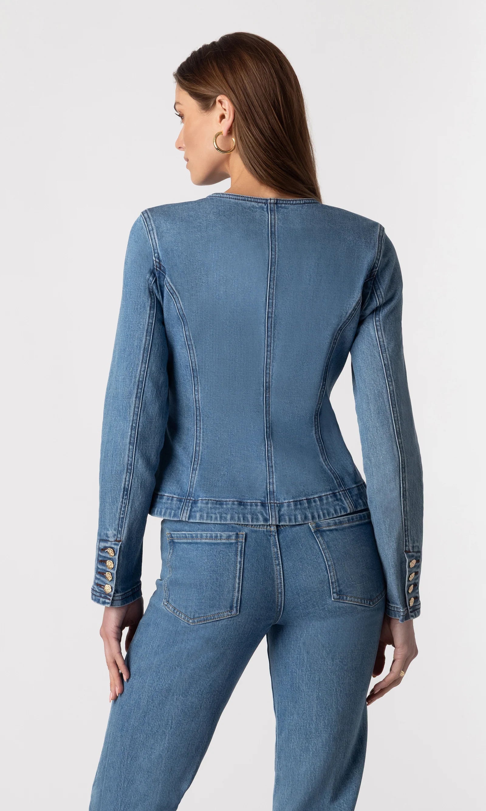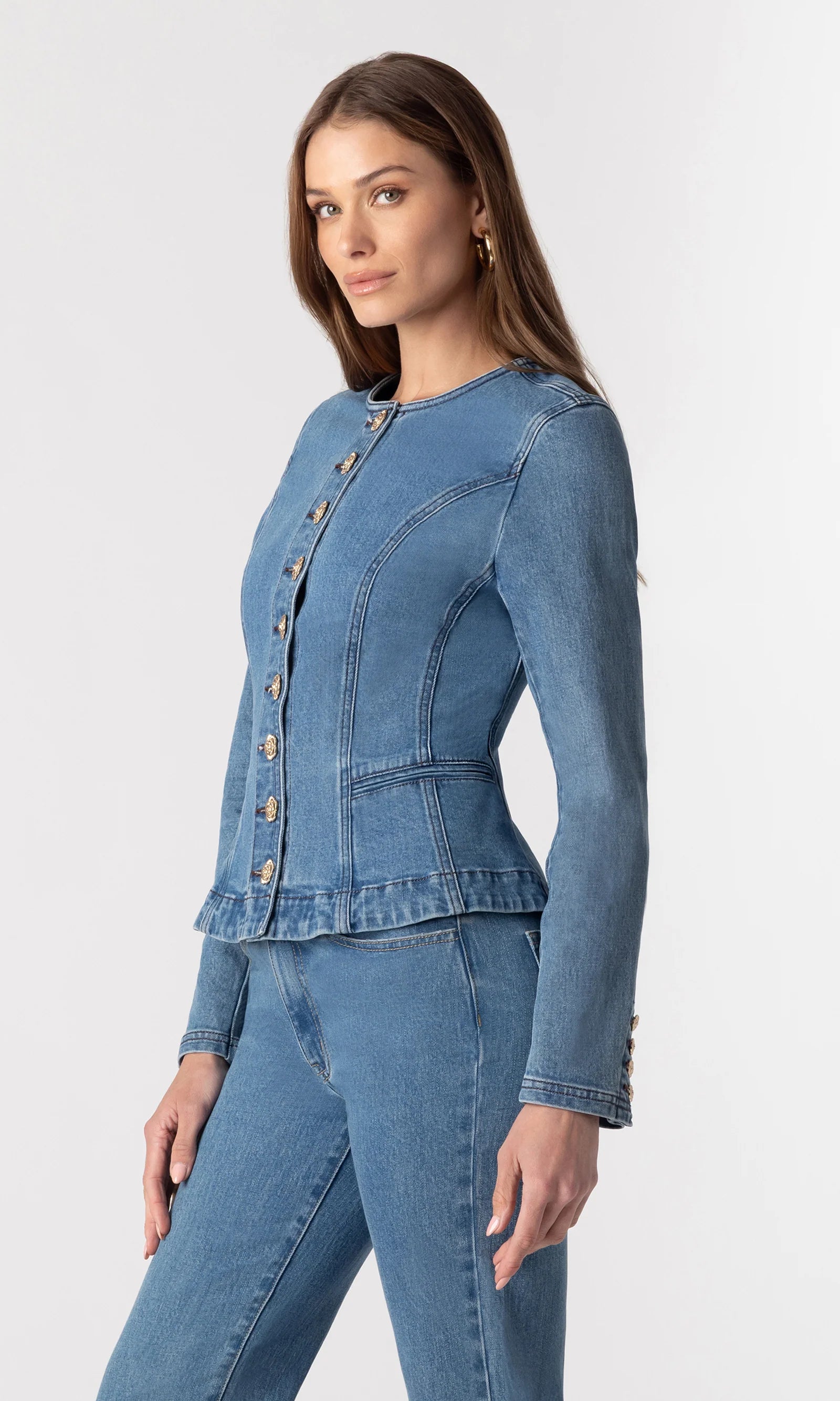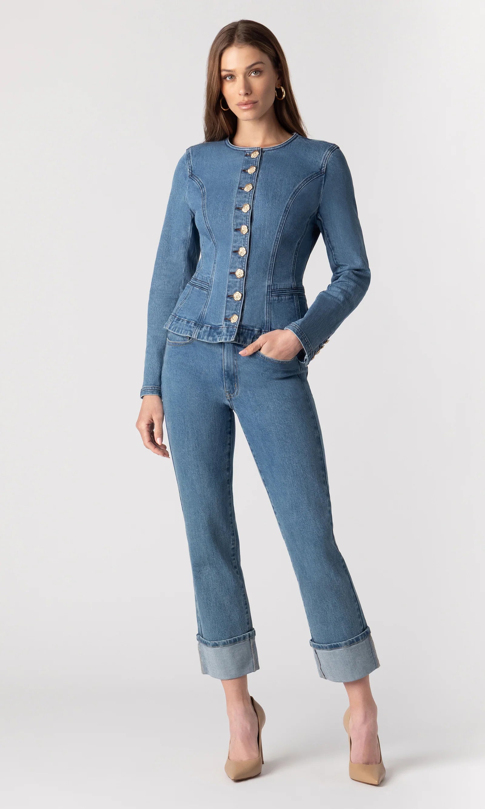 A fresh twist on a timeless classic, this denim jacket features a cinched waist and subtle peplum hem for a flattering, feminine silhouette. The stacked button front adds a polished finish, making it as versatile as it is stylish. Perfectly paired with everything from relaxed denim to sharp tailoring, it’s a wardrobe staple designed to elevate your everyday look
