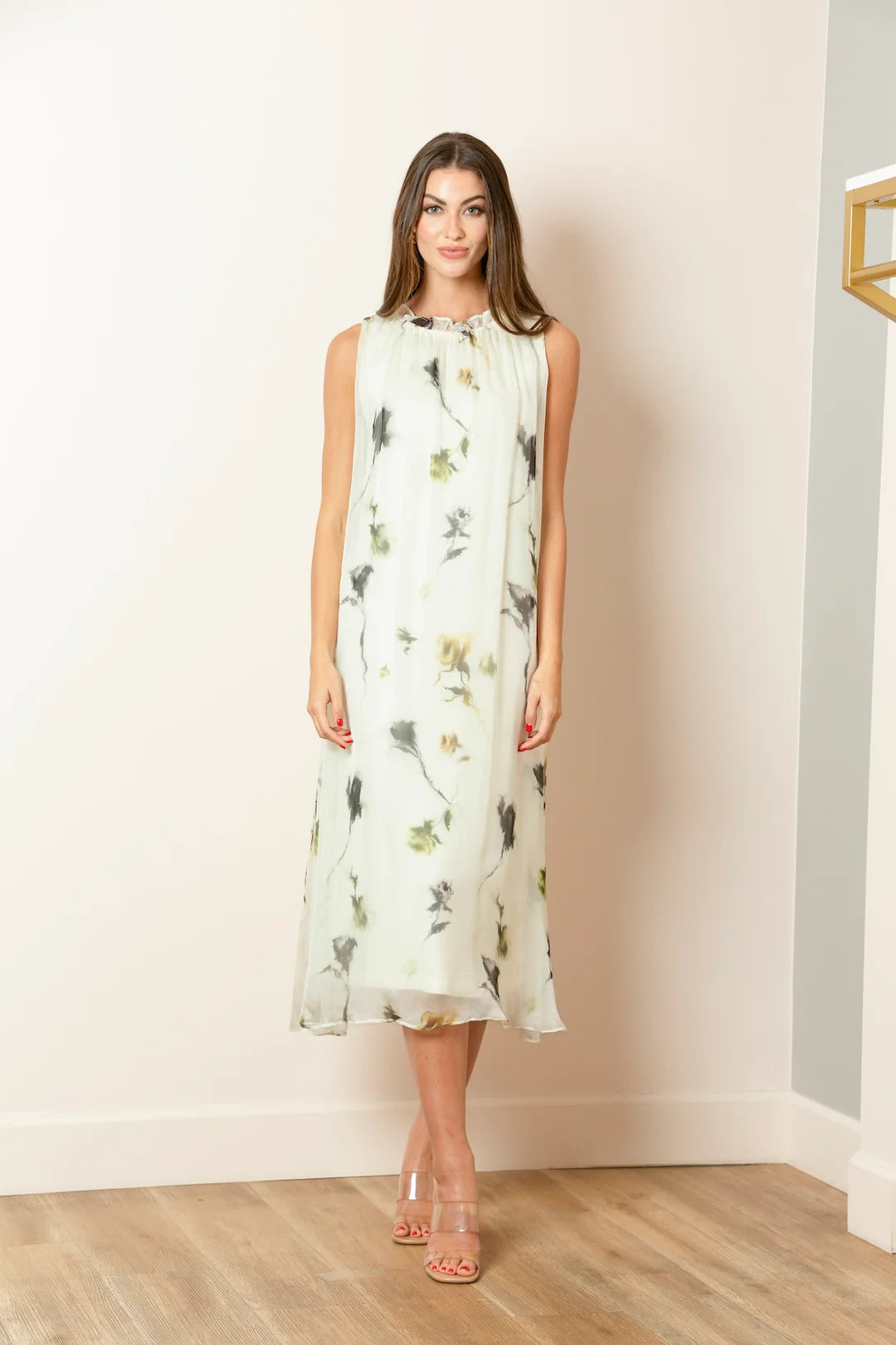 This stunning Printed Silk Sleeveless Dress exudes effortless elegance and timeless charm. Crafted from luxurious silk, it offers a fluid, lightweight feel that drapes beautifully on the body. The dress features a gathered neck design, adding a touch of sophistication and texture to the overall look. The vibrant, eye-catching print brings a playful yet refined flair, making it perfect for both daytime outings and evening events. With its sleeveless design and flattering silhouette, this dress is a versatile wardrobe staple that can be dressed up with heels or dressed down with sandals. A must-have for those seeking a blend of comfort, style, and luxury in their boutique collection