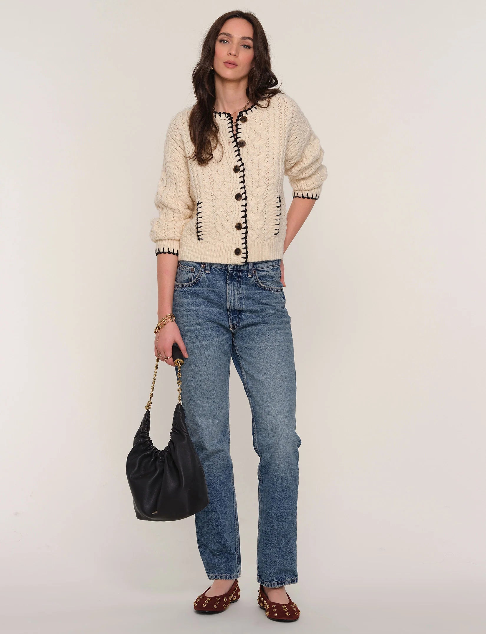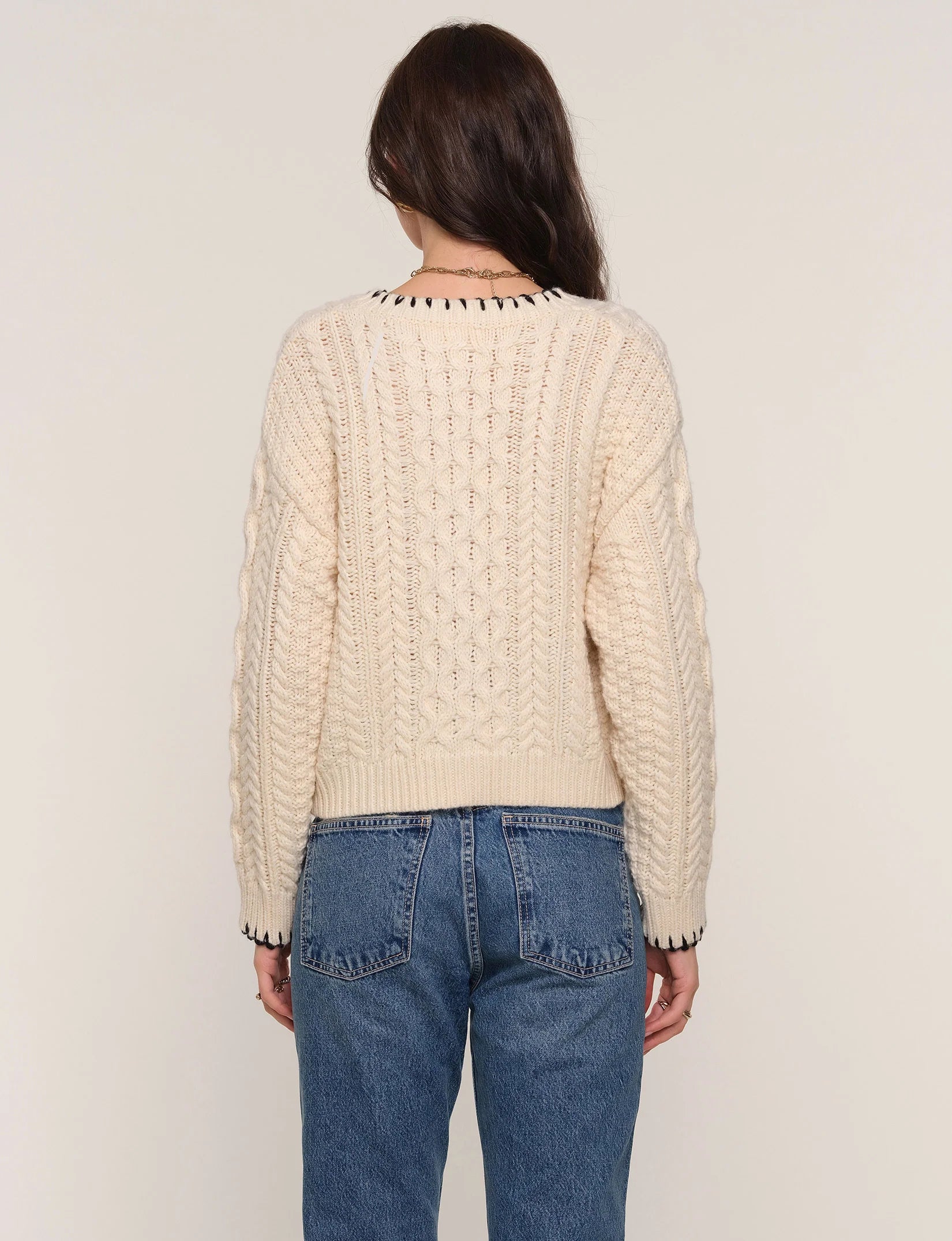 The ultimate cool-girl knit, the Renoir Cardi brings a fresh edge to classic comfort. Crafted in a relaxed fit with rich cable stitching, it features bold contrast whipstitch detailing along the neckline, front placket, pockets, and cuffs. Cozy yet statement-making, this standout layer adds instant style to any outfit—whether thrown over denim or paired with your favorite dress