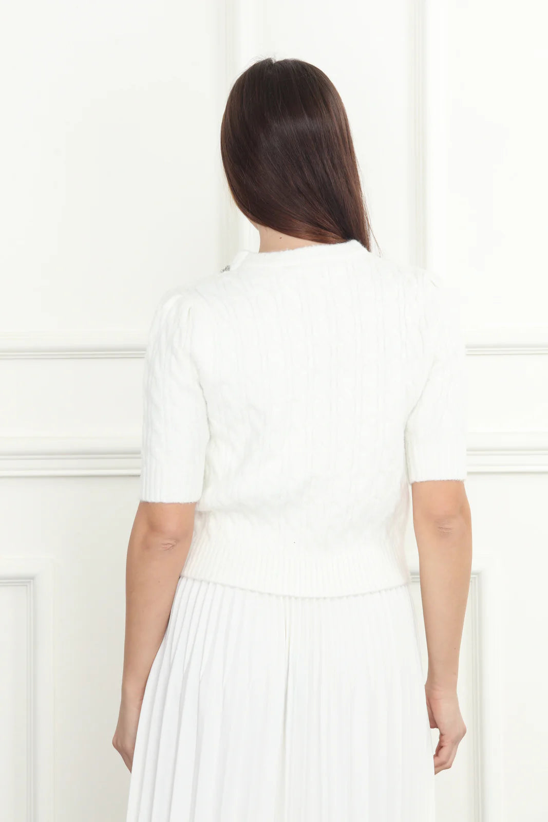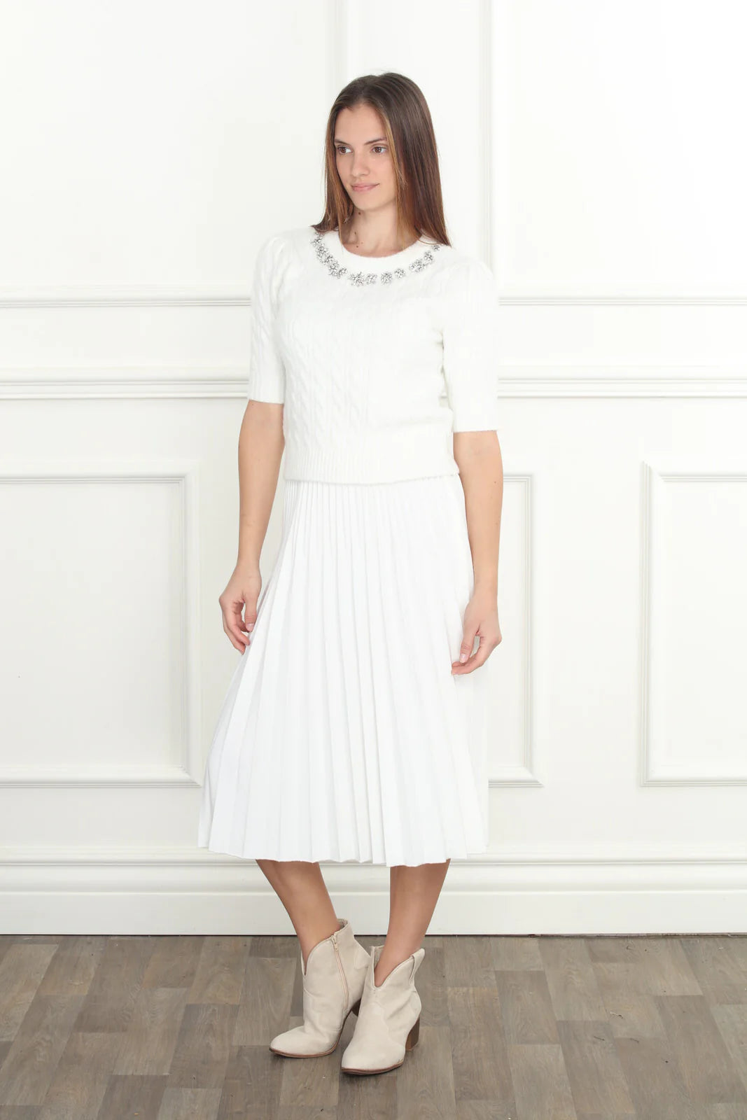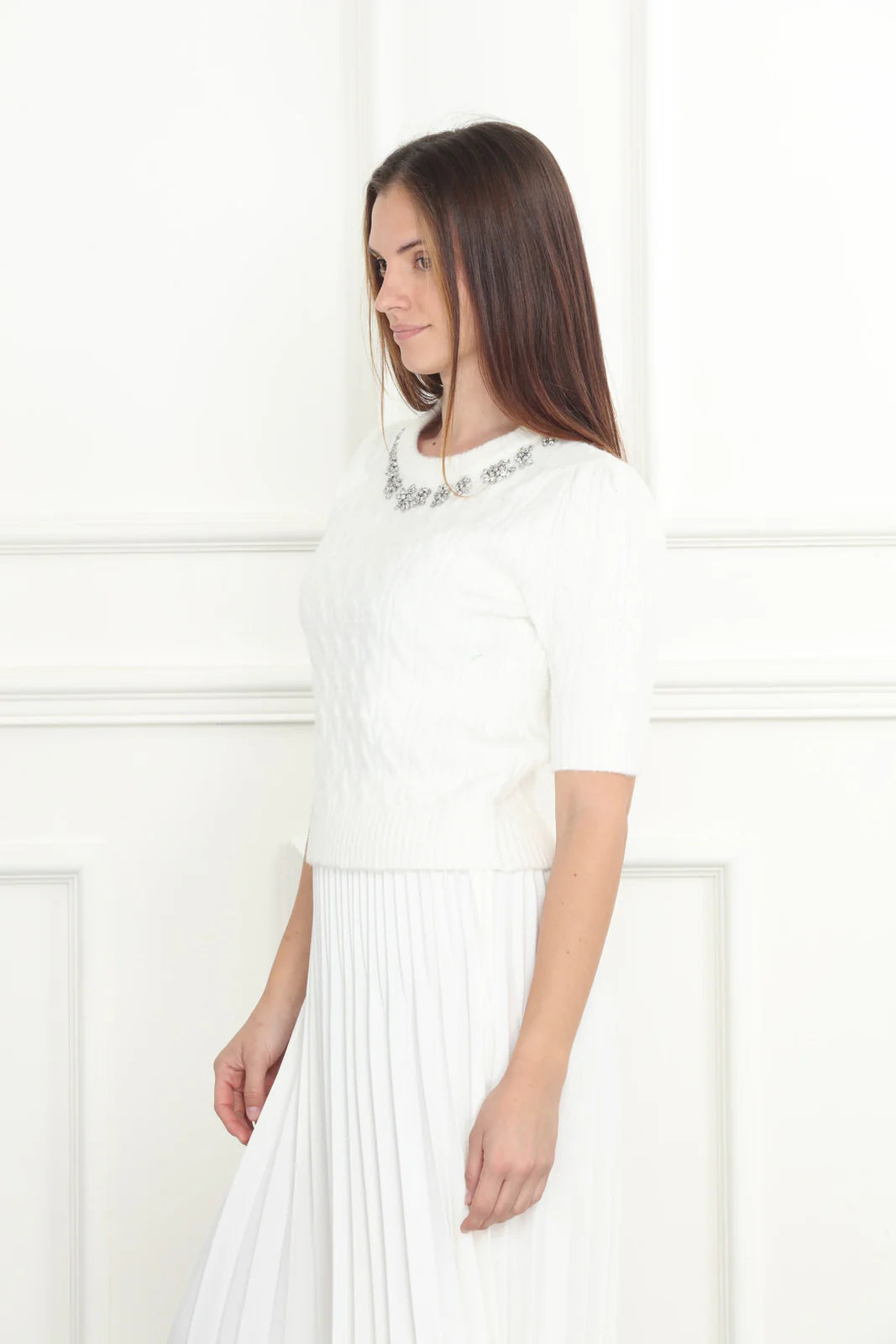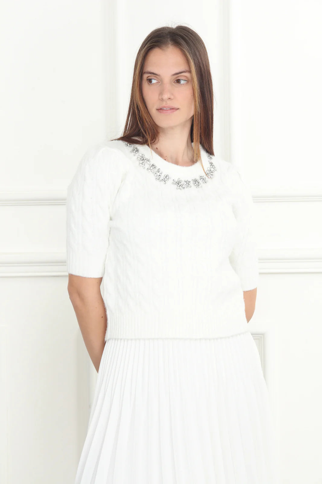 Elevate your wardrobe with our stunning Rhinestone Cable Sweater, featuring chic 3/4 sleeves and a luxurious cable-knit design. This must-have piece combines comfort and glamour, making it perfect for any occasion—from casual brunches to evening outings.