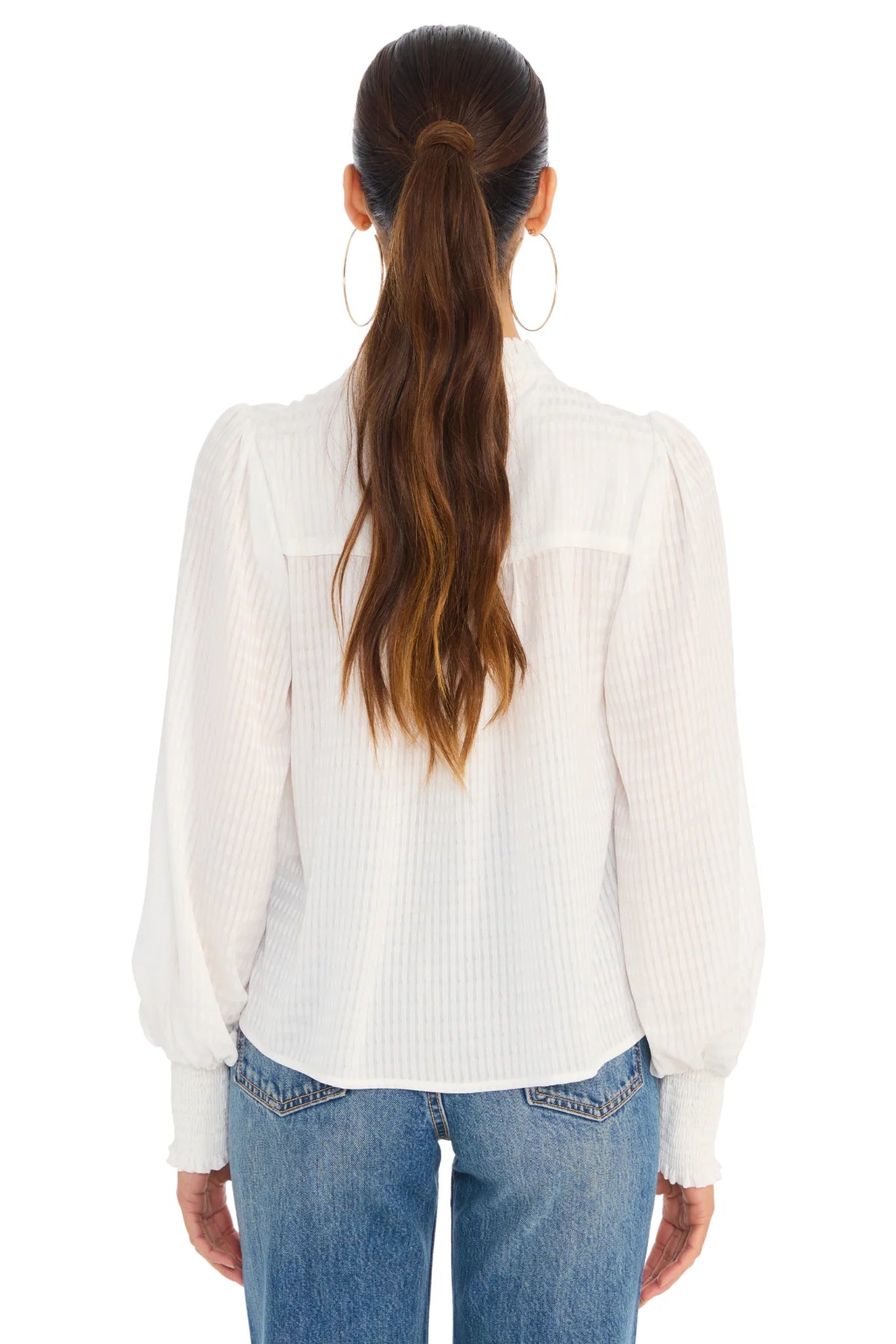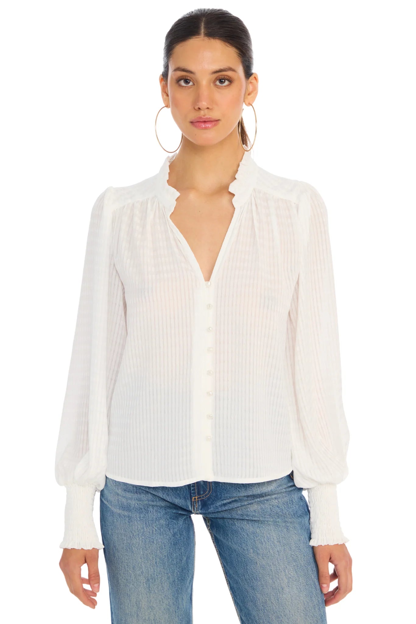 The Rhode Blouse is an instant classic; Designed with a split v neckline and a ruffle collar. Pearl buttons at the center front offer a feminine touch. Long sleeves end in a smocked cuff. Cut in a lightweight jacquard fabrication with a loose fit throughout the body and sleeves and is unlined