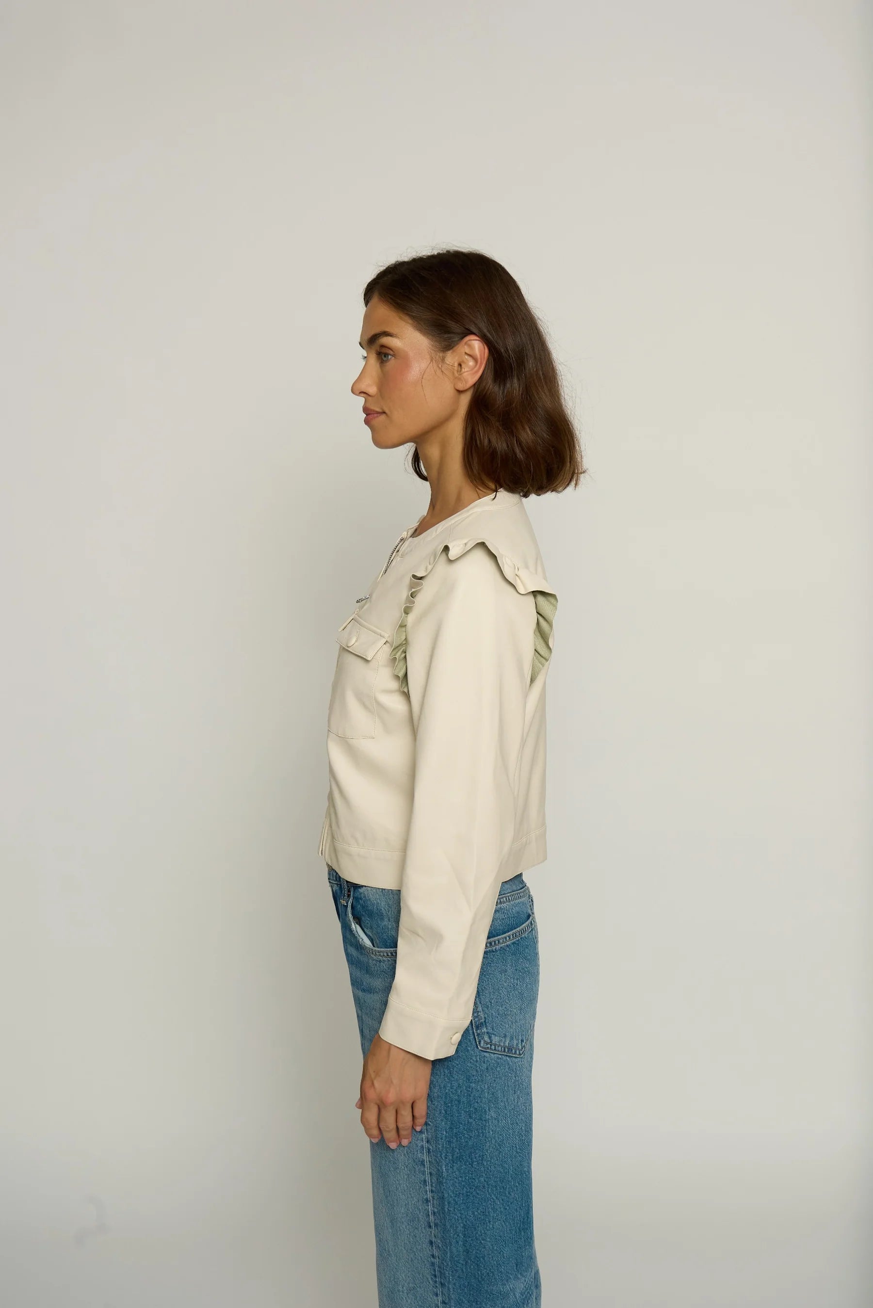 This ivory-colored jacket offers a sleek, structured fit with a touch of elegance. Featuring ruffled shoulder details, it adds a feminine flair to your wardrobe. The front zipper closure and round neckline create a clean, polished look, while two chest pockets with flap accents provide both style and functionality. Its modern, versatile design makes it perfect for both casual and chic outfits, ensuring you'll stand out in any setting