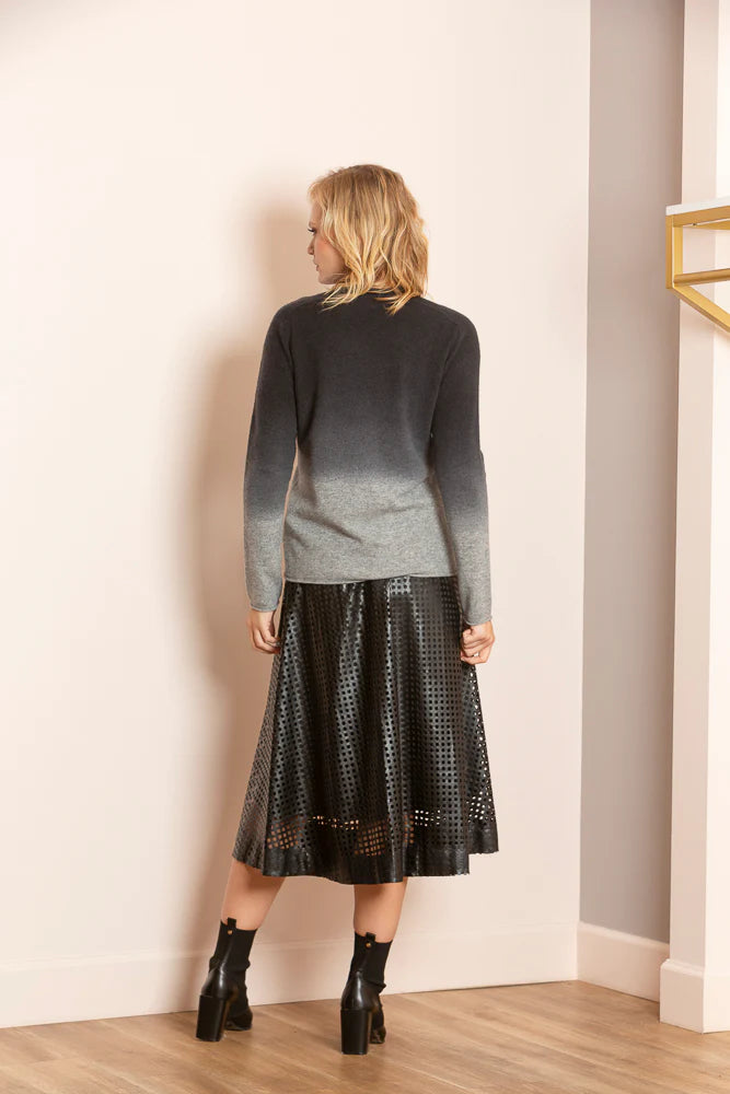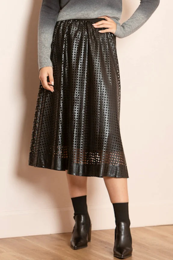 Elevate your wardrobe with the Serena Skirt—crafted from sleek perforated pleather for a subtle edge and breathable comfort. Featuring a gathered silhouette and a flexible elastic waistband, this midi-length skirt combines effortless style with all-day ease. Perfect for layering with tailored tops or oversized knits, it’s a versatile piece that redefines modern sophistication