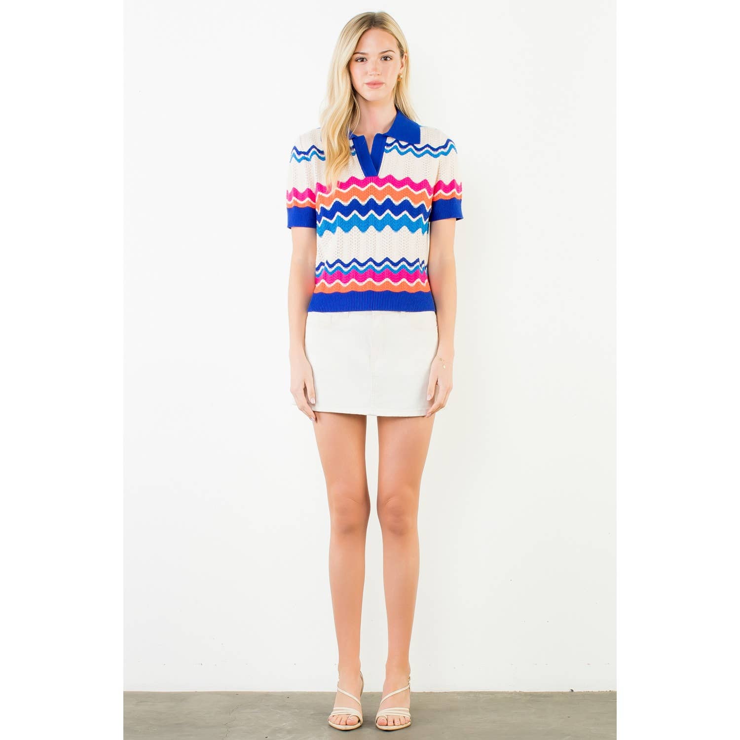 Short Sleeve Collared Zigzag Knit Top
