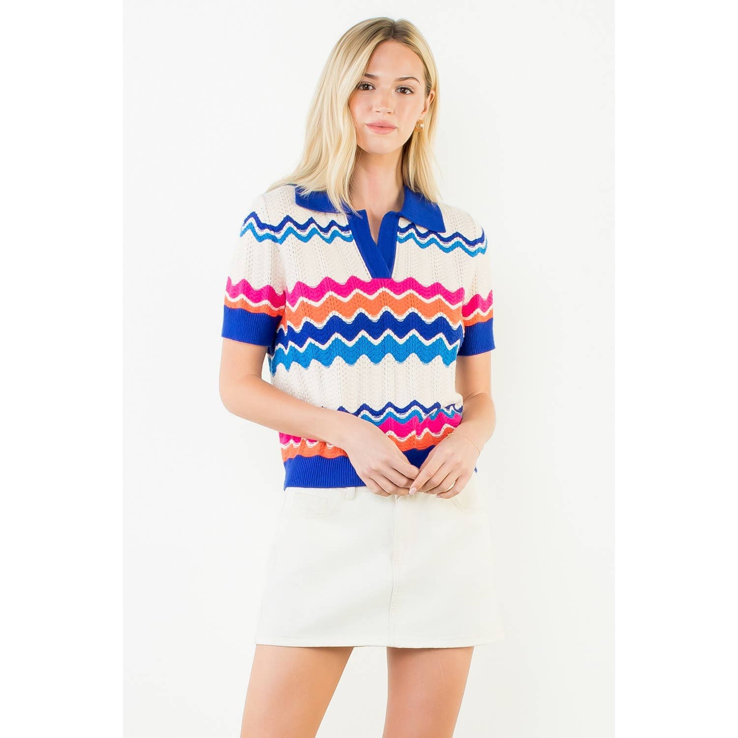 Add a playful pop of pattern to your wardrobe with our Short Sleeve Collared Zigzag Knit Top. Designed to stand out while staying effortlessly wearable, this chic knit features a bold zigzag pattern that brings texture and personality to a timeless silhouette. The structured collar adds a polished touch, perfectly balancing the fun pattern with a hint of sophistication. Crafted from a soft, breathable knit, this top offers a comfortable, flattering fit that moves with you throughout the day. The short sleeves make it ideal for layering or wearing solo in warmer weather. Pair it with tailored trousers for an elevated look, or style it with your favorite denim for an easy, everyday statement.