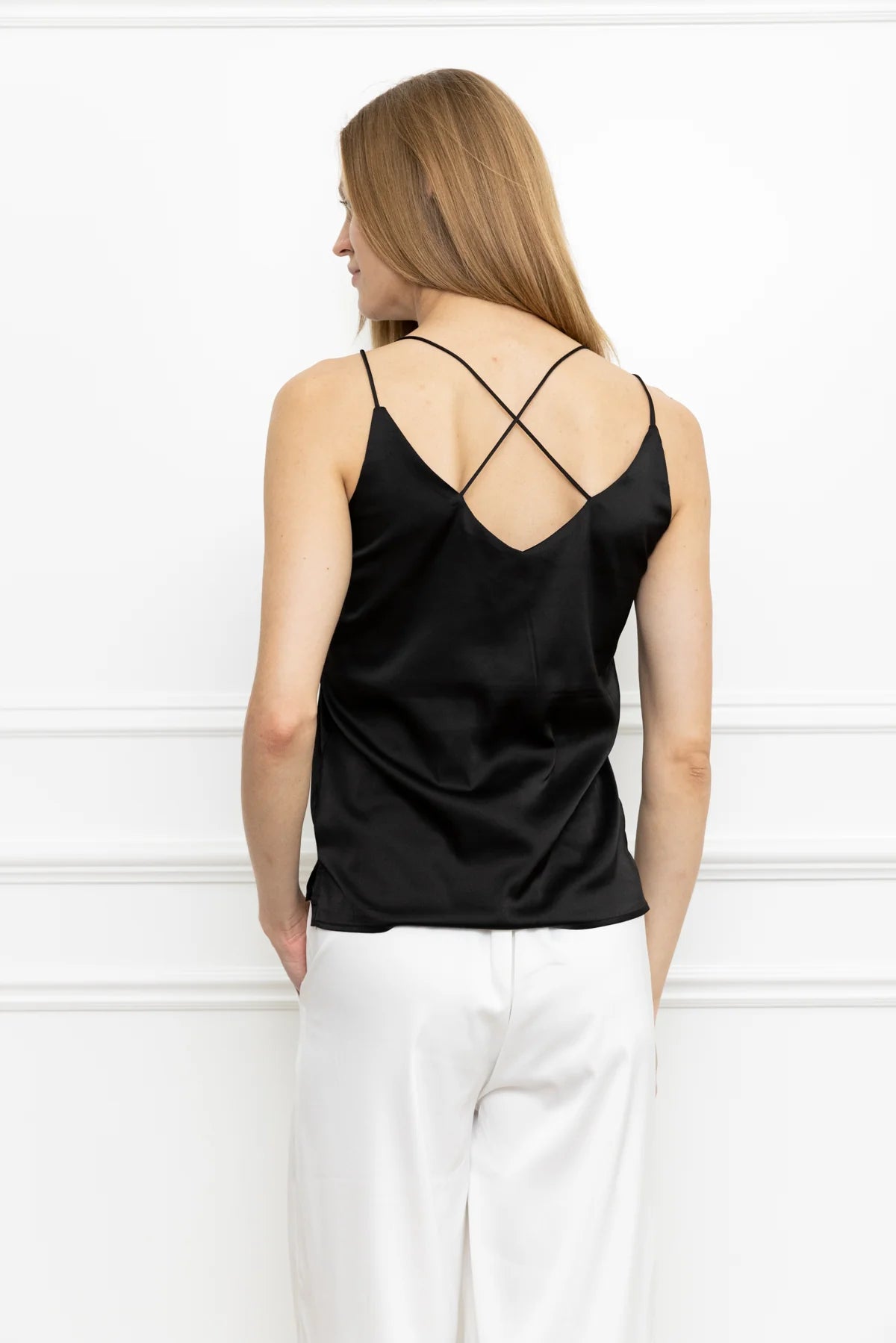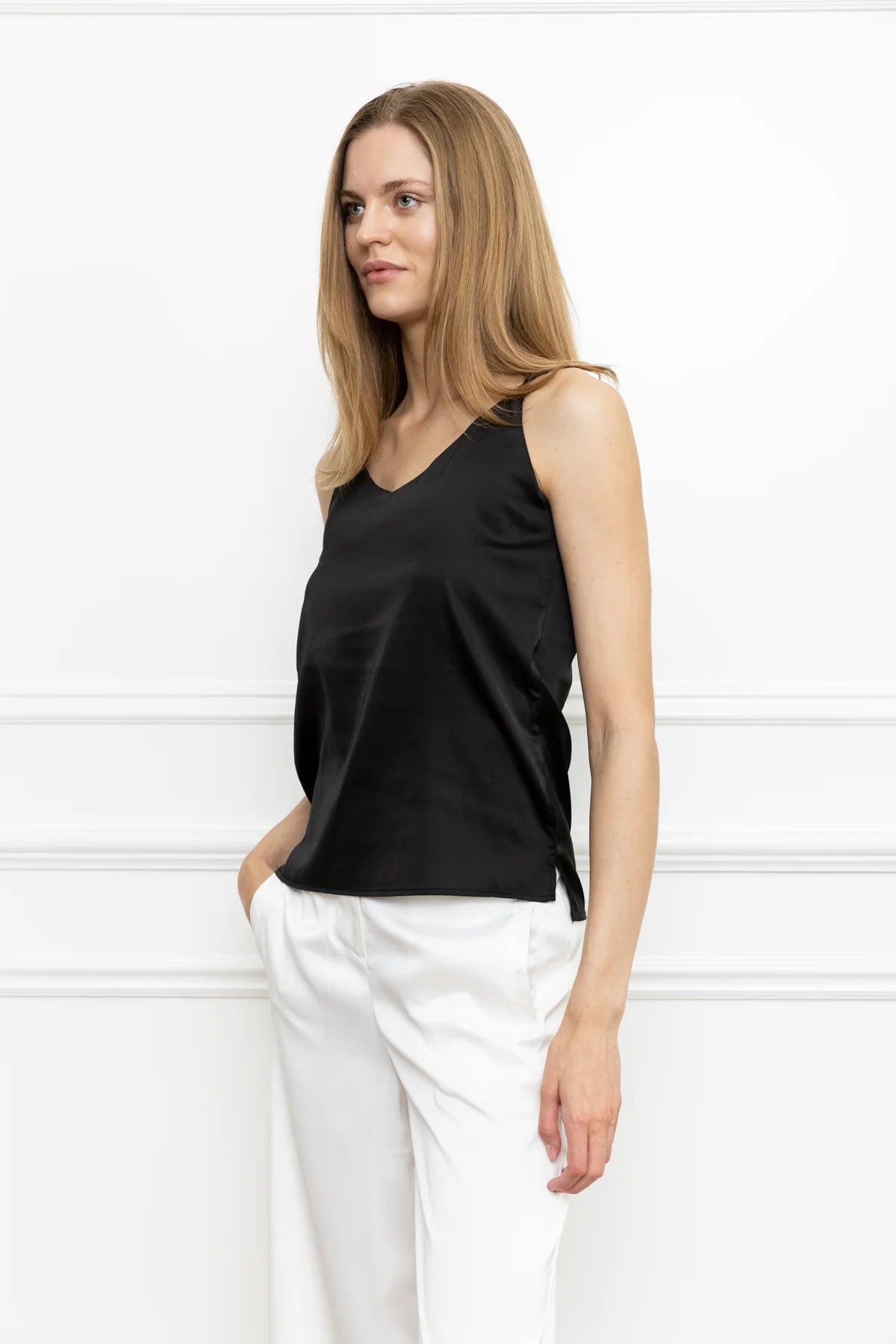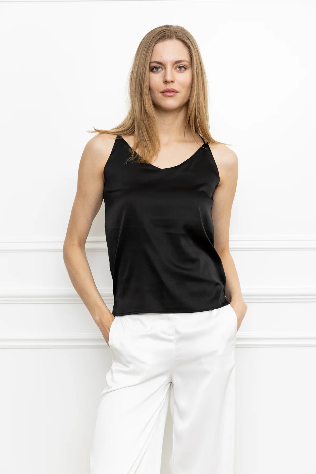 ndulge in luxury with our Silky Camisole, a wardrobe essential that exudes elegance and versatility. Made from a sumptuous, soft satin fabric, this camisole drapes beautifully against the skin, offering a sleek silhouette that flatters all body types.Featuring delicate adjustable straps and a subtle V-neckline, this piece is perfect for layering or wearing on its own. The understated sheen adds a touch of sophistication, making it ideal for both casual outings and dressy occasions