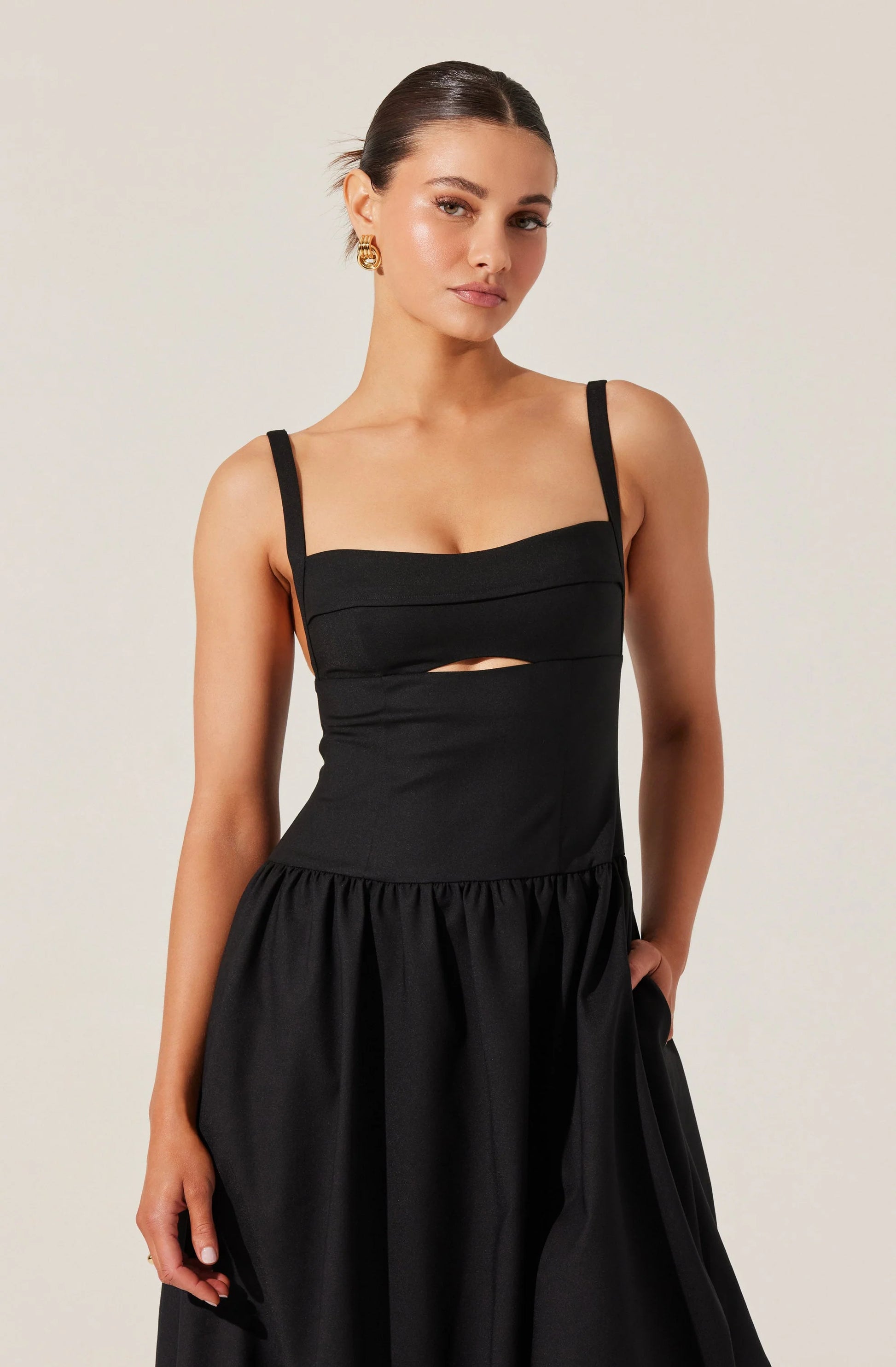 The Sleeveless Bubble Midi Dress is a stunning blend of playful elegance and modern sophistication. With a fitted bodice that beautifully contours the figure, this dress features a small, subtle cutout detail just under the center bust, adding a hint of intrigue. The full, gathered bubble skirt creates a flattering, voluminous silhouette that exudes effortless charm and movement. Functional side pockets provide both style and practicality, while the fully lined interior ensures comfort and quality. Finished with a concealed back zipper, this dress offers a smooth, seamless look that is perfect for both special occasions and chic everyday wear. A versatile and stylish addition to any boutique, this dress effortlessly combines femininity with a contemporary edge