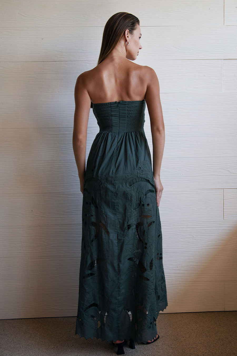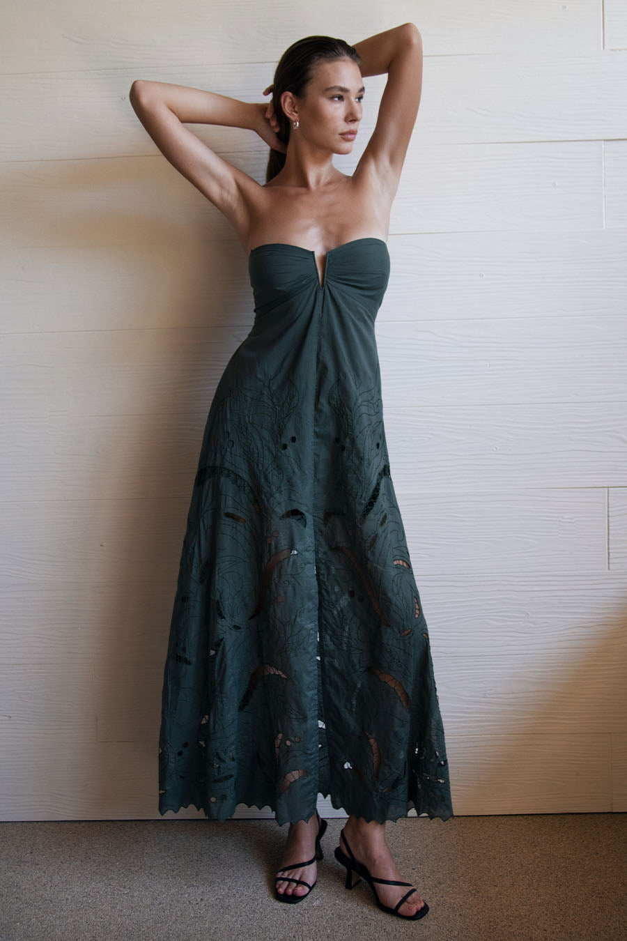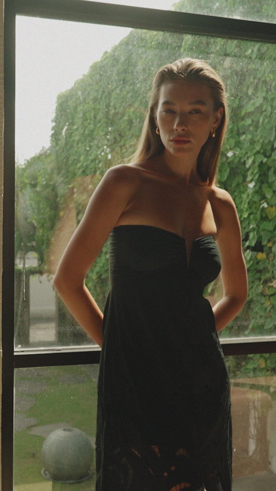 This dress features unique cut-out embroidery throughout, adding a touch of intrigue and artistry to its sleek design. A daring front split enhances the silhouette, offering a glimpse of leg that balances allure with sophistication. Whether styled for a casual daytime event or dressed up for an evening out, the Ayla ensures you look effortlessly chic.