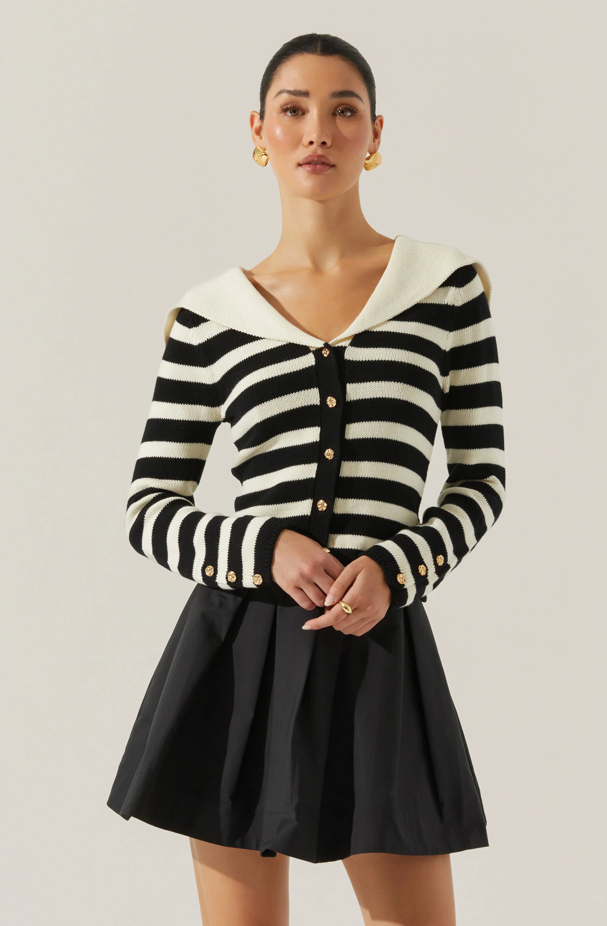 This Stripe Sailor Collar Cardigan brings a nautical charm to your wardrobe with its playful yet polished design. The classic sailor collar adds a touch of vintage elegance, while bold stripes create a fresh, eye-catching pattern. Detailed with shiny gold buttons along the center front and sleeve cuffs, this cardigan exudes a refined, elevated style. Whether you’re dressing up for a casual day out or adding a sophisticated touch to a relaxed outfit, this cardigan is a timeless piece that blends classic style with modern flair