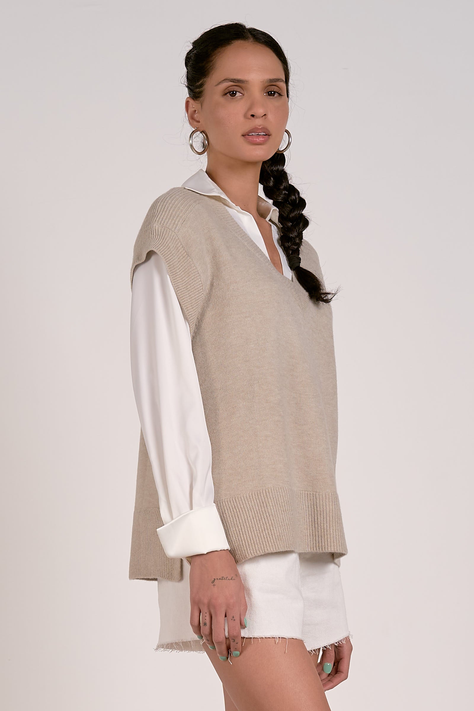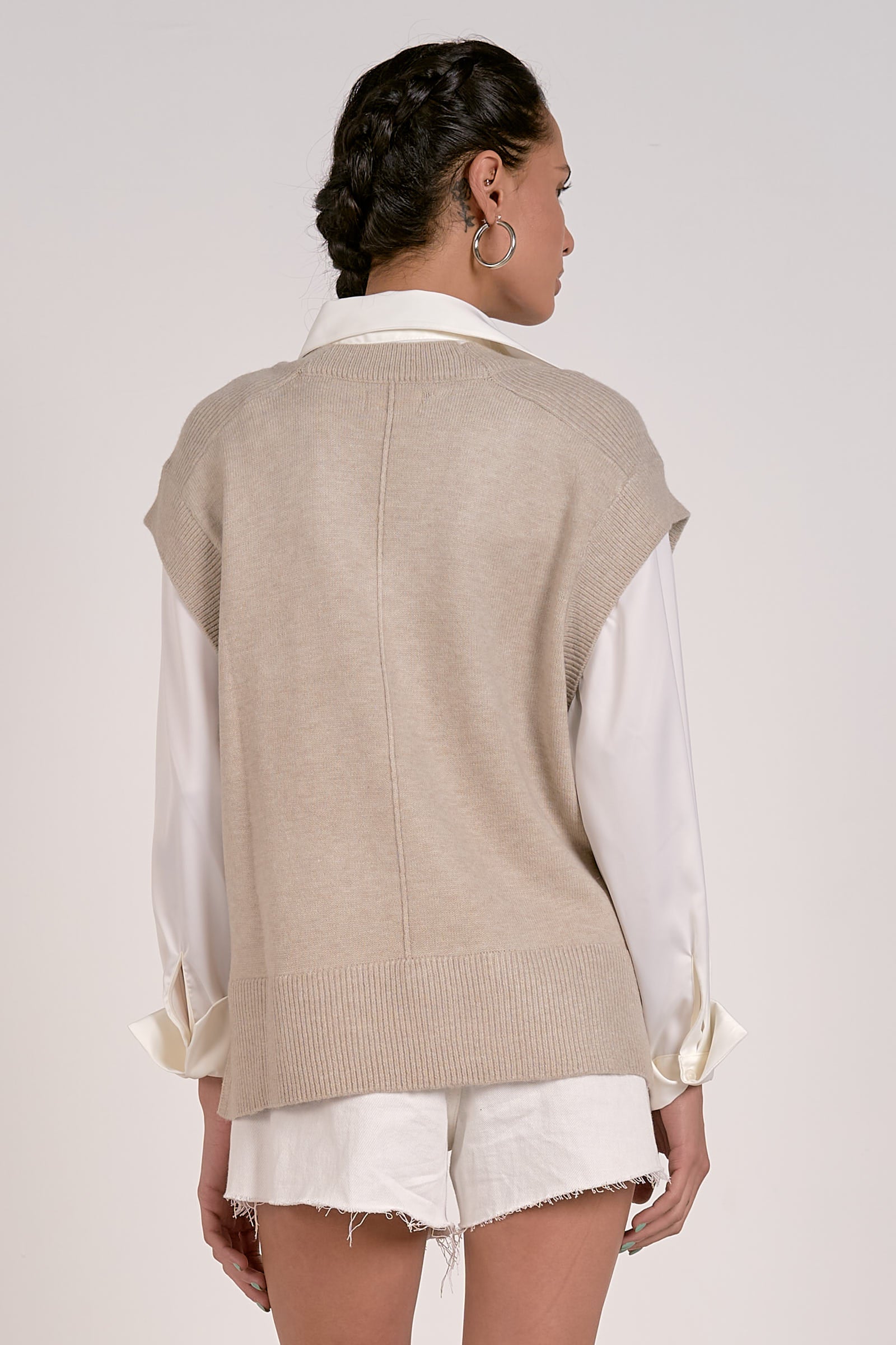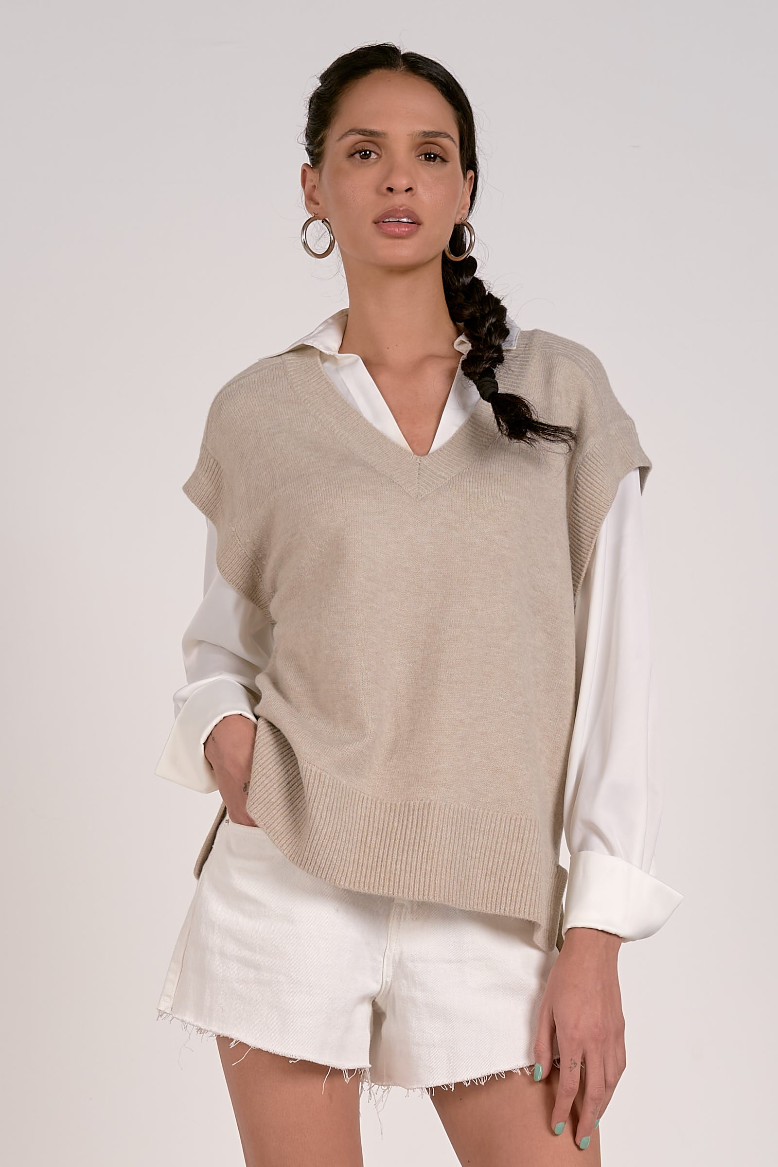 This Sweater Vest Shirt combines cozy sophistication with effortless style. Featuring a lightweight sweater vest design layered over a satin button-down shirt, it offers the perfect balance of warmth and breathability. The versatile vest adds a touch of texture and refinement, while the shirt underneath provides a crisp, polished look. Ideal for layering over jeans, skirts, or trousers, this piece is perfect for transitioning between seasons or creating a chic, preppy vibe. Whether worn for work or weekend outings, it’s a stylish, versatile addition to any wardrobe