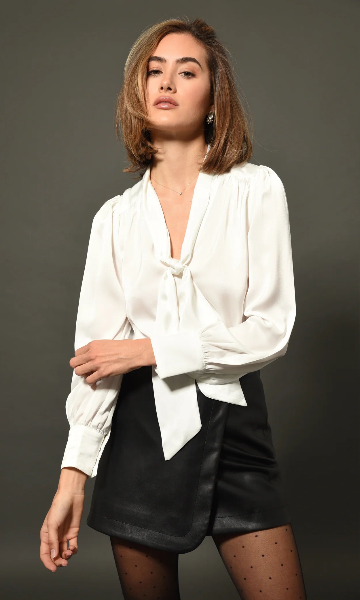 The Edna neck tie blouse features a high neck collar that can be tied in any form or even left alone for that open tie look. The puff sleeves and sateen fabric add a touch of elegance to this style.