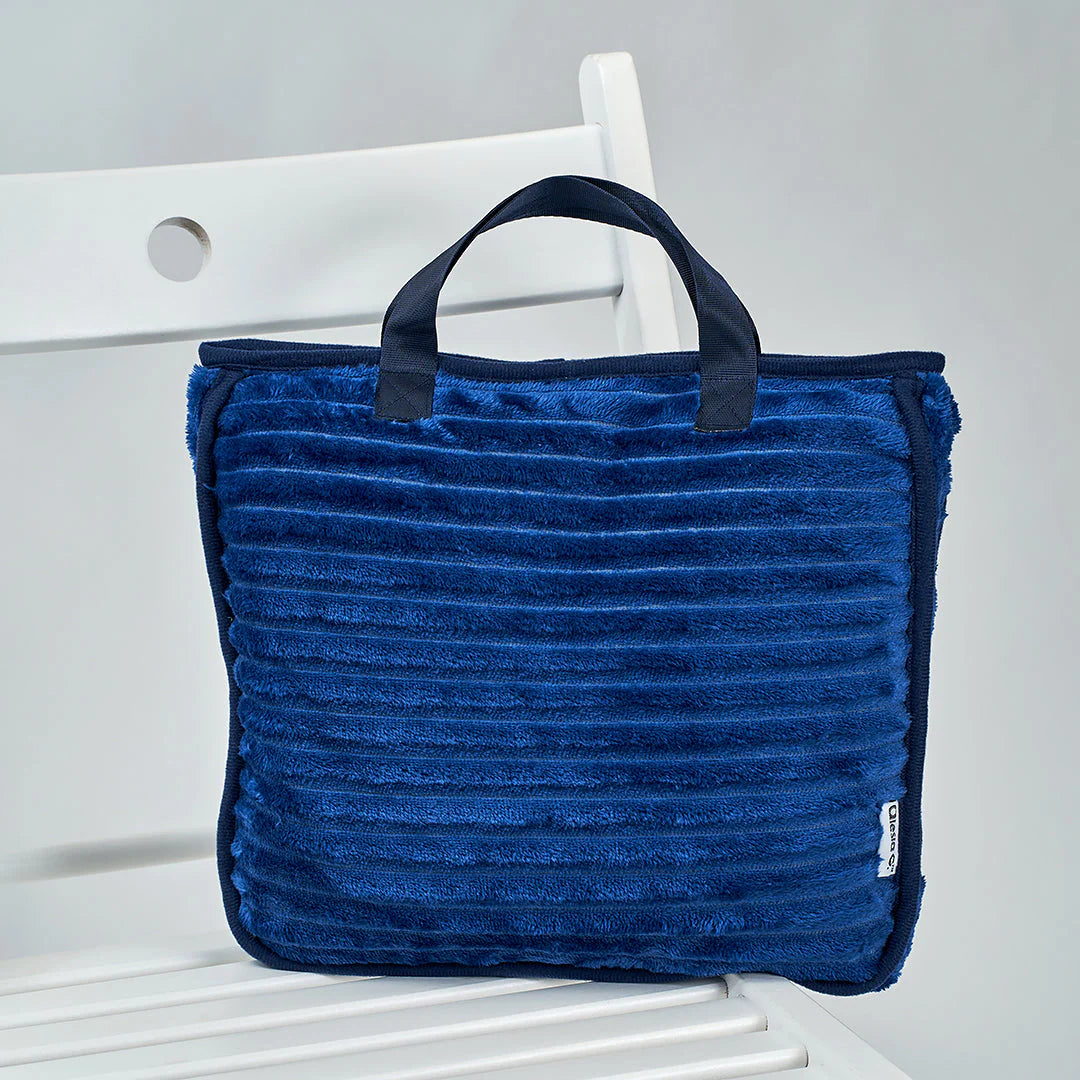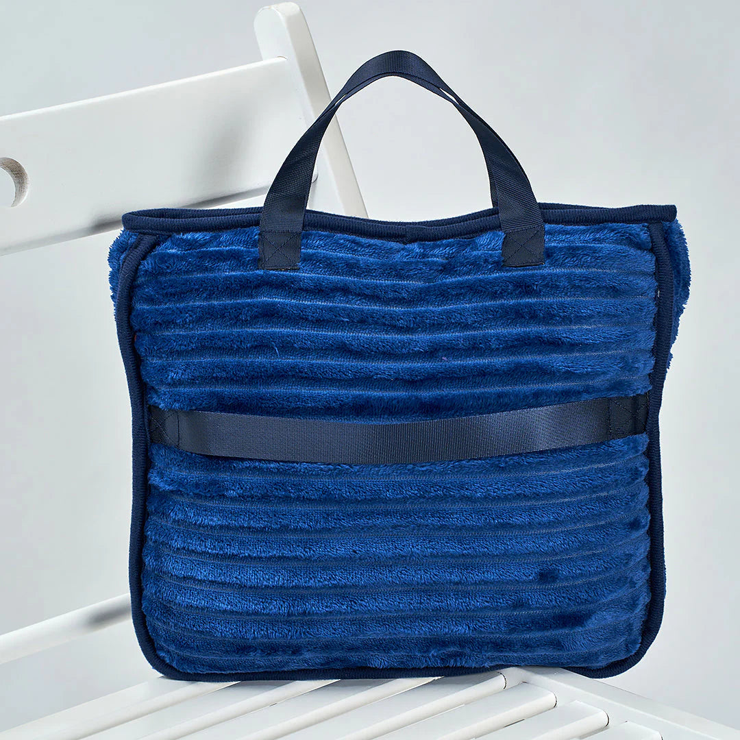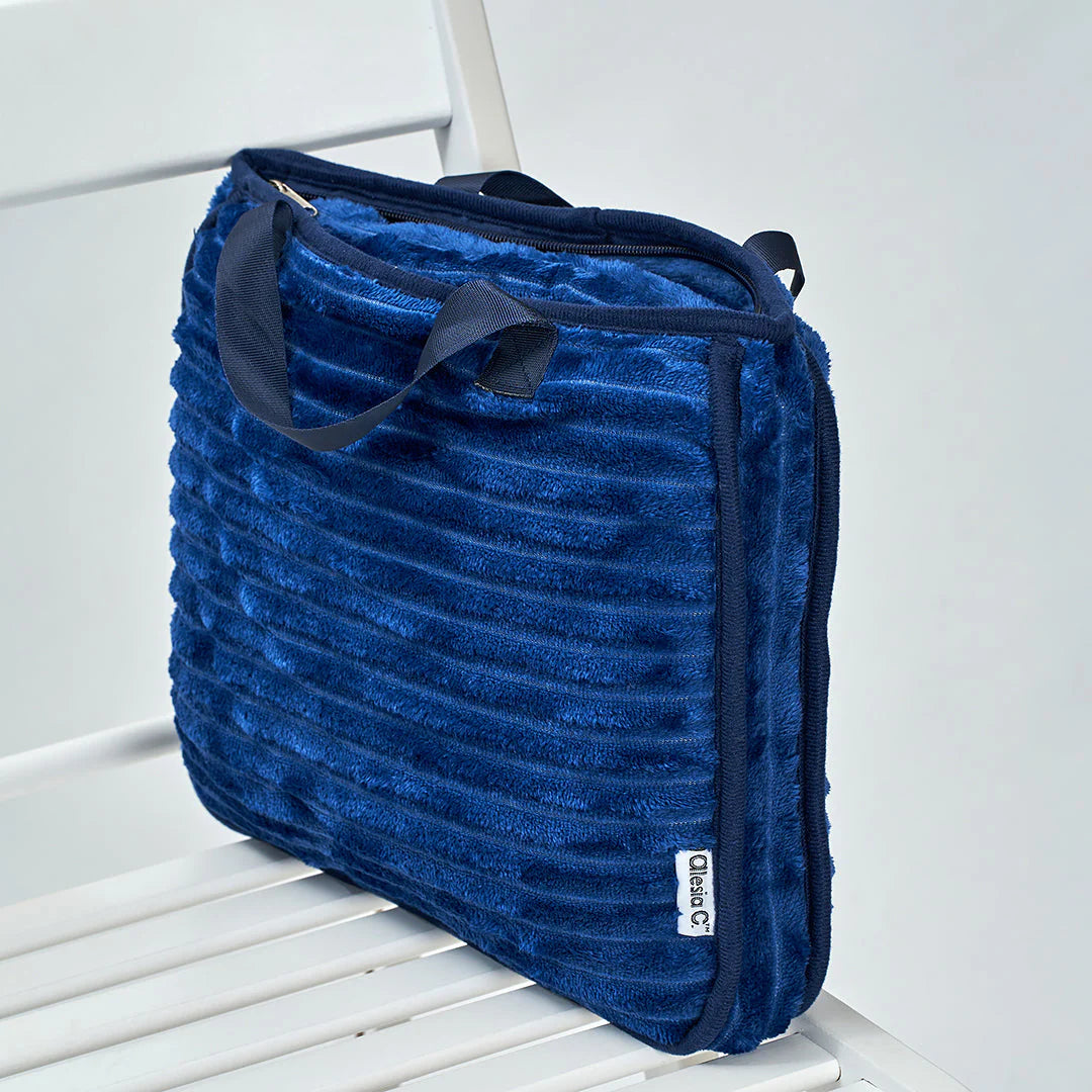 Blanket size: 50" W x 60" H (127x152cm). Blanket is folded in the plush travel bag. Plush bag size:13”x11”with 1.5” sides and bottom. Featuring 1" wide two jacquard handles and one horizontal jacquard luggage strap at the back of bag for easy carry on your briefcase handle. Use your folded travel-blanket-bag as a pillow for restful sleep or as a lumbar support chair pillow in your office or car.