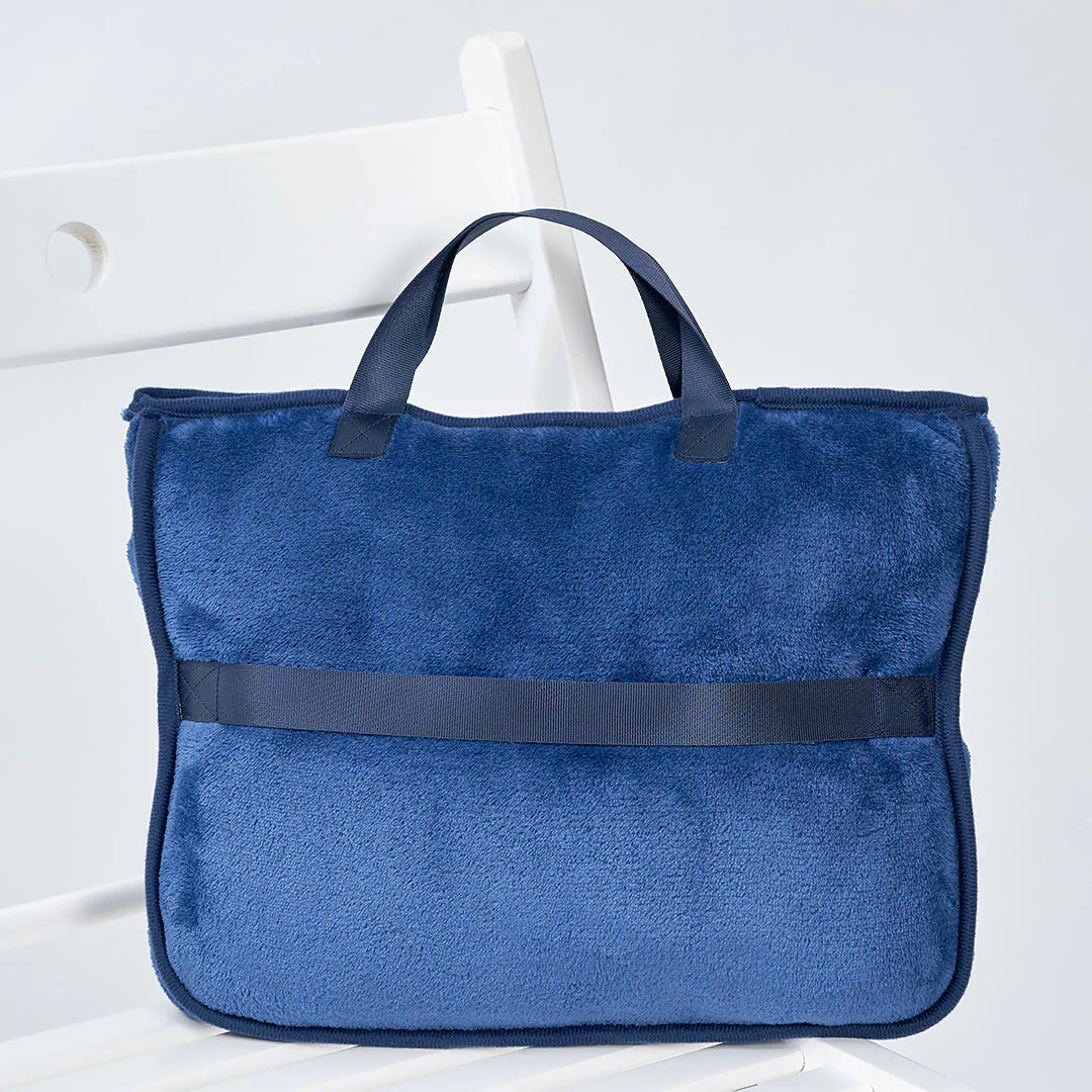 Blanket size: 50" W x 60" H (127x152cm). Blanket is folded in the plush travel bag. Plush bag size:13”x11”with 1.5” sides and bottom, elegantly outlined with decorative ribbon. Featuring 1" wide two jacquard handles and one horizontal jacquard luggage strap at the back of bag for easy carry on your briefcase handle. Use your folded travel-blanket-bag as a pillow for restful sleep or as a lumbar support chair pillow in your office or car.