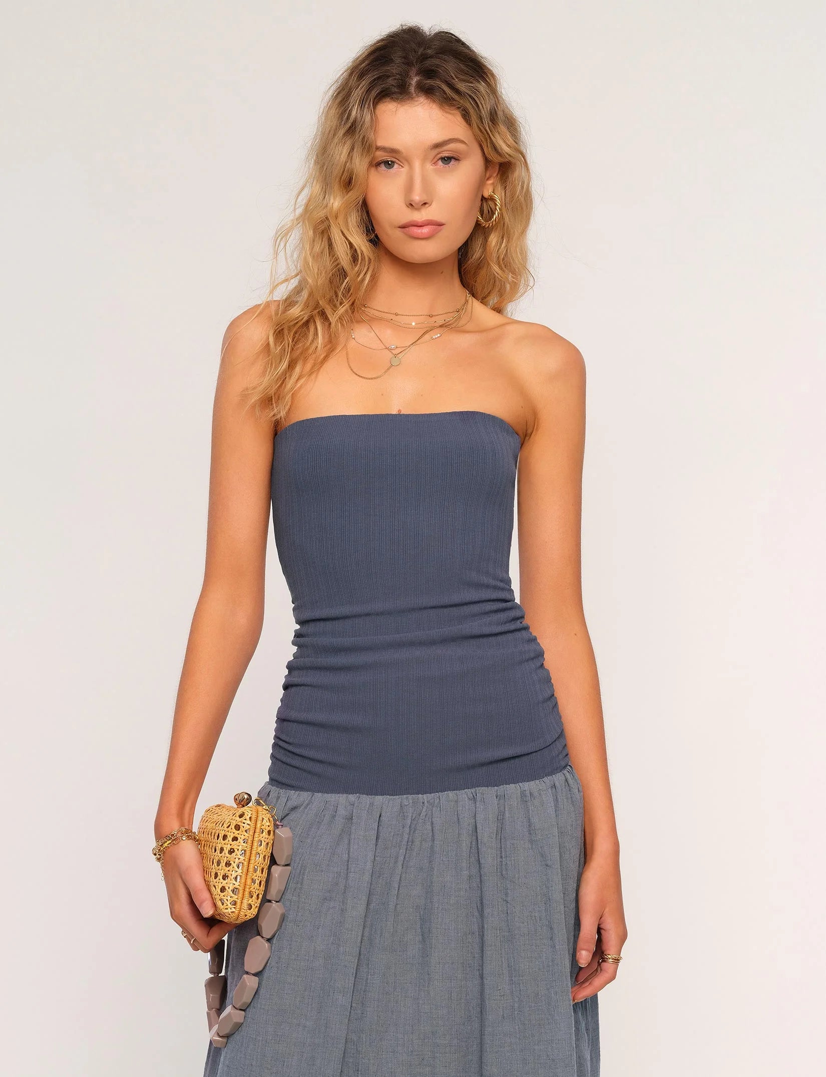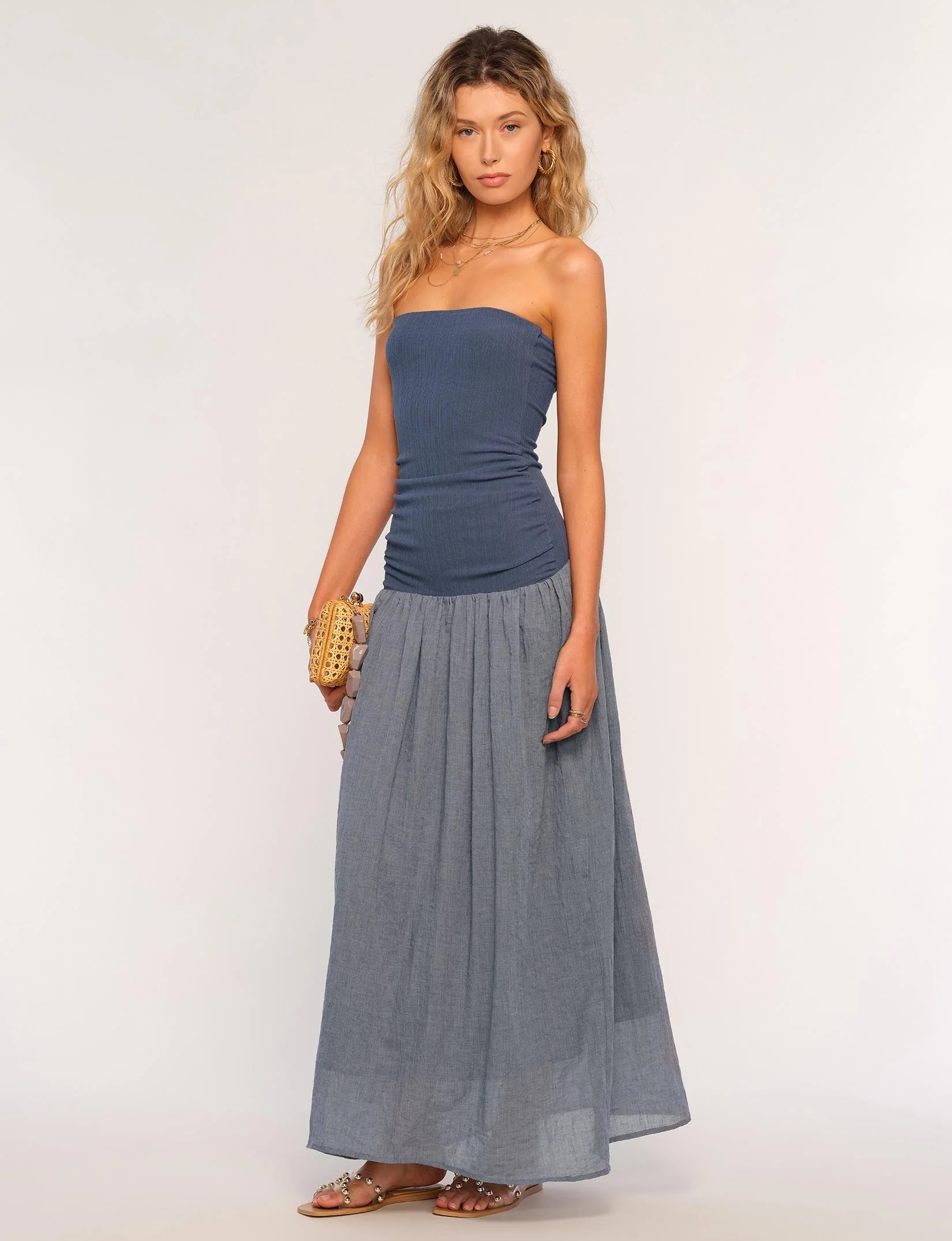 Introducing the dropped waist, silhouette of the season, The Venus Dress. The strapless bodice is made from a stretchy, rib knit and has shirring at the side seams. The ankle length skirt is made from a light weight woven voile. This dress gives off the perfect, effortlessly chic vibe