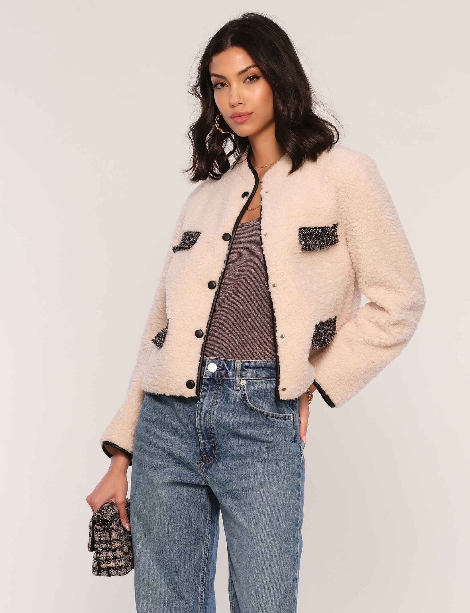 Introducing a chic yet casual jacket, the Zania Jacket. Made from faux shearling it features contrast piping around the edge and tweed pocket flaps with a front snap closure. We love it paired with vintage denim and a lightweight sweater