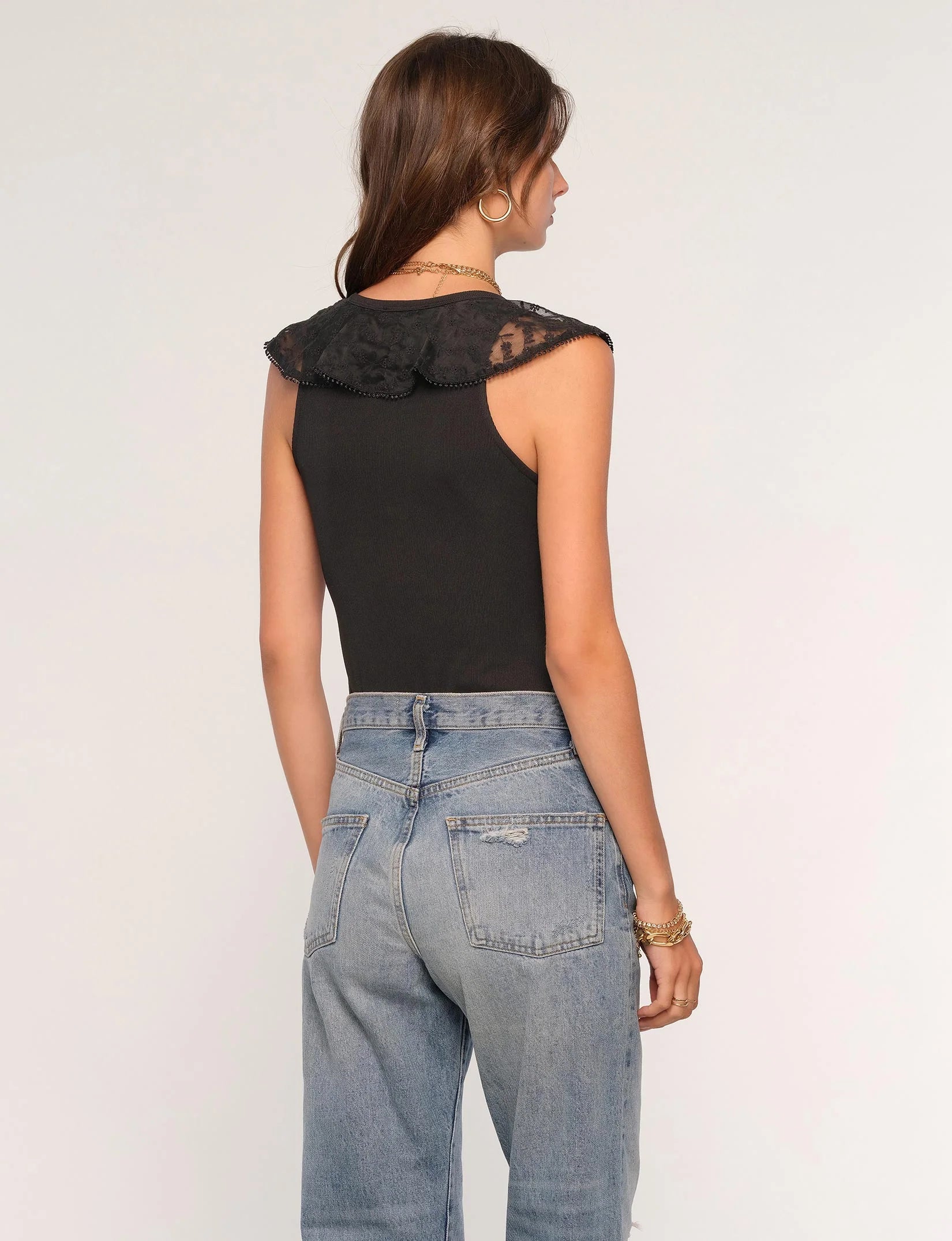 The Zoella Bodysuit is a simple knit, made from a soft rib. It features a lace ruffle around the neck, and tucks in perfectly with jeans, trousers, or shorts!